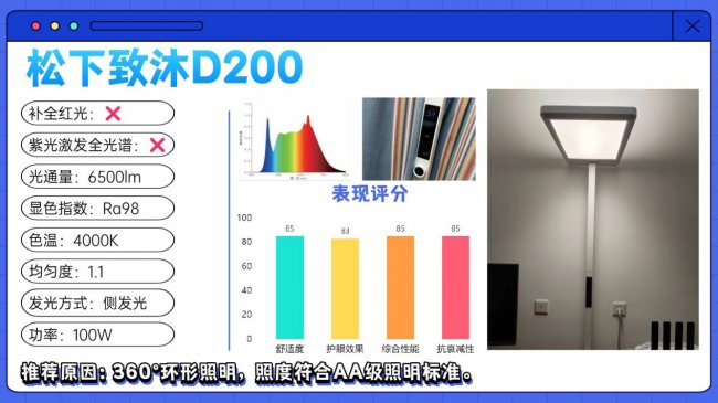 儿童护眼大路灯哪个牌子好用?松下致沐D200属于品牌的基础款护眼大路灯,整体是比较常规的一体式发光面设计,内部搭载280颗全光谱灯珠,并结合侧发光结构,实现360°环形照明,实现比较大范围的照明,操作上配备液晶触控面板,支持无极亮度调节,日常调光和使用都比较直观,基本功能是够用的,不过从核心表现来看,它的自研主控芯片在抗光衰方面属于中规中矩水平,长期使用后光效可能会有一定衰减,另外蓝光实测值接近1.0,虽然在安全范围内,但相对来说偏高一些。