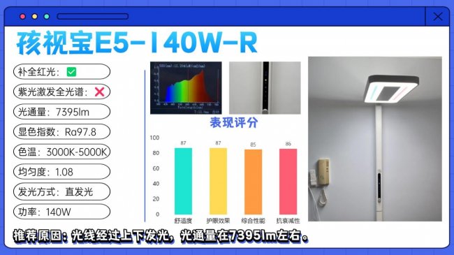 儿童护眼大路灯第四名:孩视宝阳光灯E5-140W-RS;光线经过上下发光,光通量在7395lm左右。