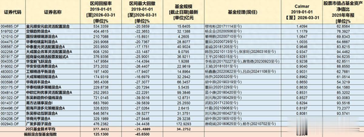 本文以卡玛比率(Calmar Ratio,区间年化回报与最大回撤之比)作为核心标尺,对2019年1月1日至2026年3月31日期间的偏股型基金再一次进行筛选:首先遴选出卡玛比率最高的100只基金,继而剔除其间基金经理频繁更迭、策略缺乏连续性的产品,再过滤掉合并规模小于1亿元、可能存在流动性或清盘风险的“迷你基金”。