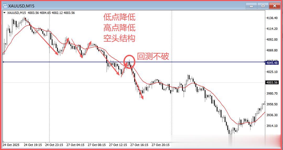 图中是黄金15分钟的K线图,形成了低点降低,高点也降低的空头结构价格,向上测试压力不破,这就是趋势要延续的信号。