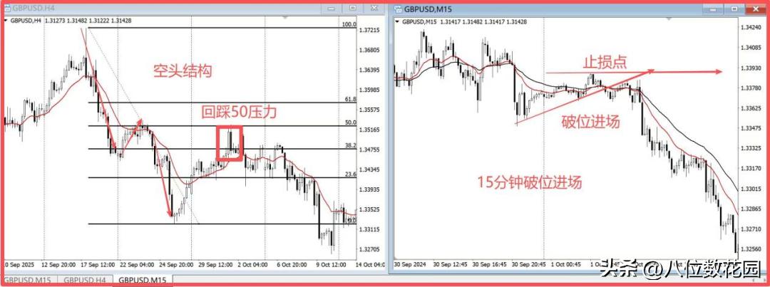 图中是英镑兑美元1小时级别,是下跌结构,他们不会盲目追单,而是等价格切换到压力位,切换到15分钟图,均线重新死叉,价格下破支撑位,顺势做多。