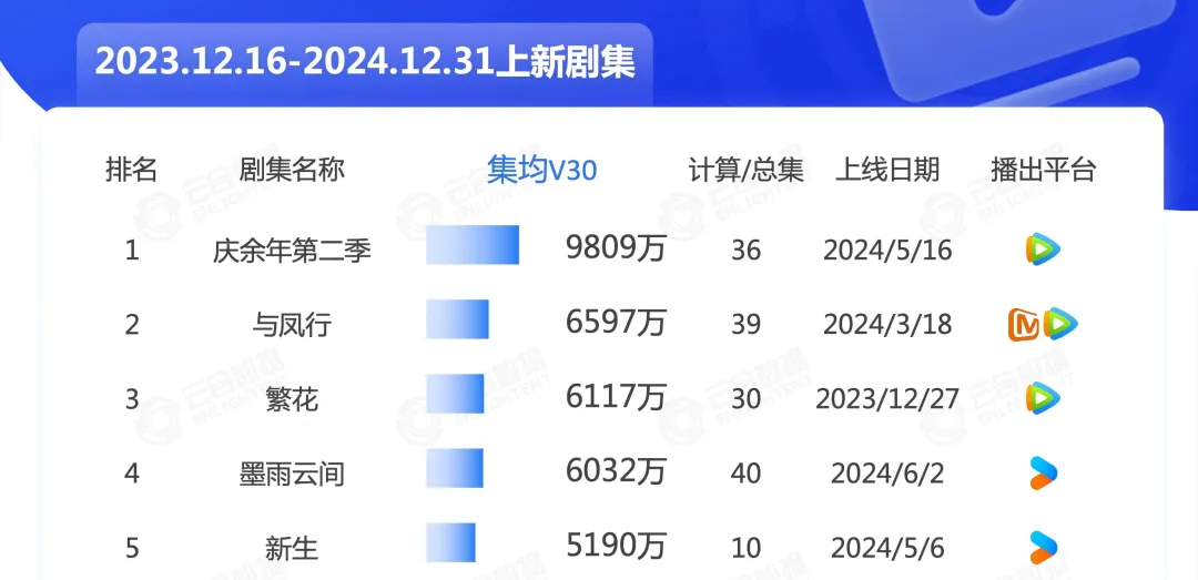 在长剧网播“回看”比“追看”更为普遍的当下,V30集均统计依旧具有最大的参考价值。