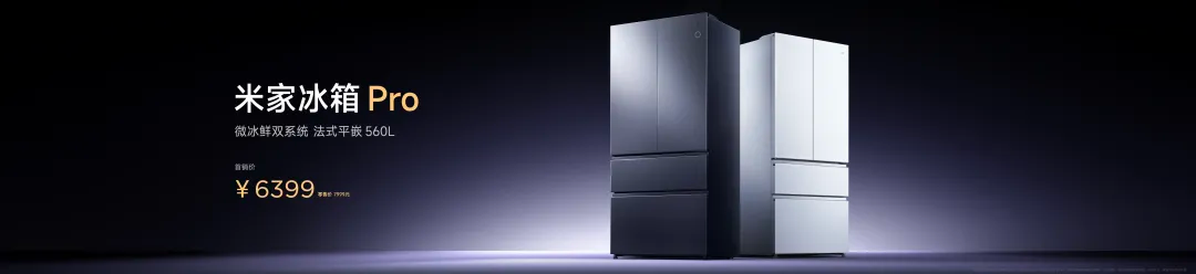 米家冰箱 Pro 微冰鲜双系统 560L:作为小米首款高端法式平嵌冰箱,600mm 超薄机身可零缝隙嵌入标准橱柜,底部前置散热设计无需预留两侧空间。创新微冰鲜舱采用 -0.5℃ 精准控温技术,牛肉存放 10 天仍保持鲜嫩口感,实现 “免解冻切配”;全自动制冰系统 55 分钟快速出冰,24 小时制冰量达 1.22kg,冰格经抗菌认证可直接接触食材。机身采用冰晶白、星锻银两种肤感玻璃面板,31 分贝运行噪音低于图书馆环境,超一级能效日耗电仅 0.74 度,首销价 6399 元。
