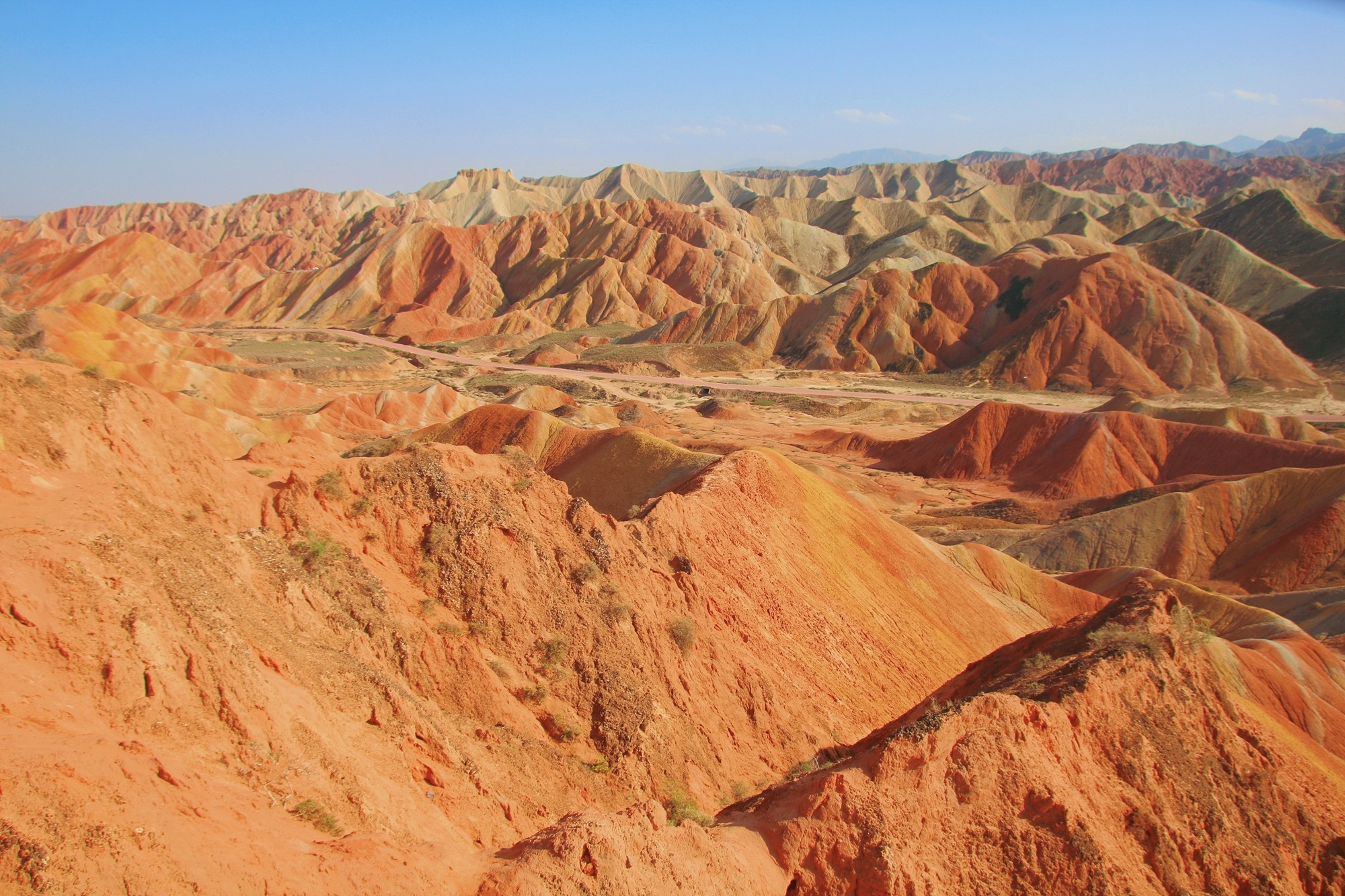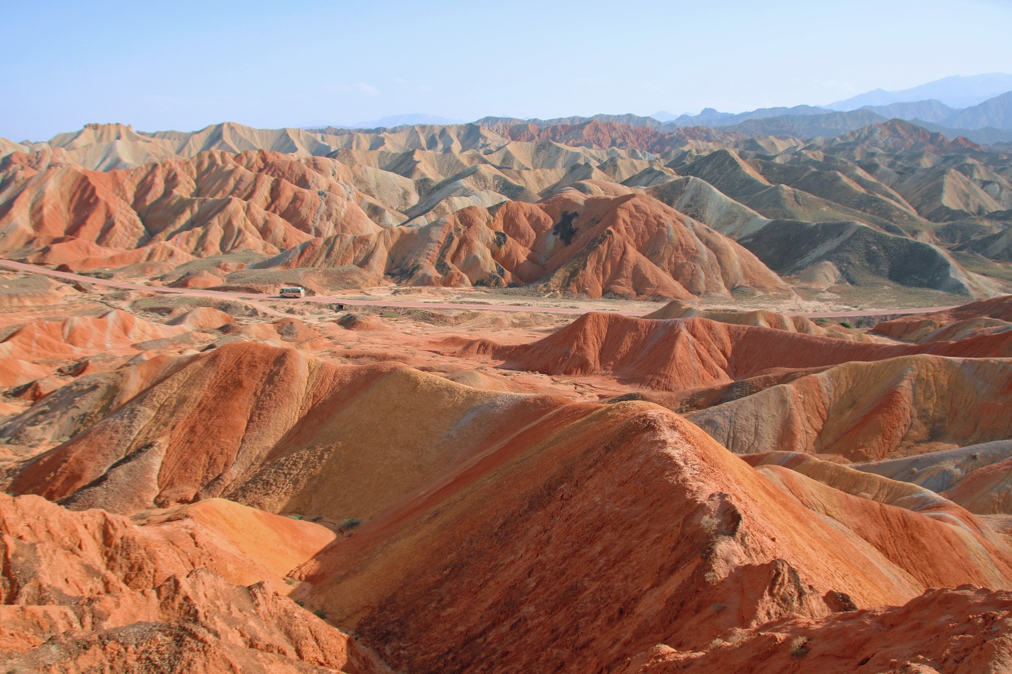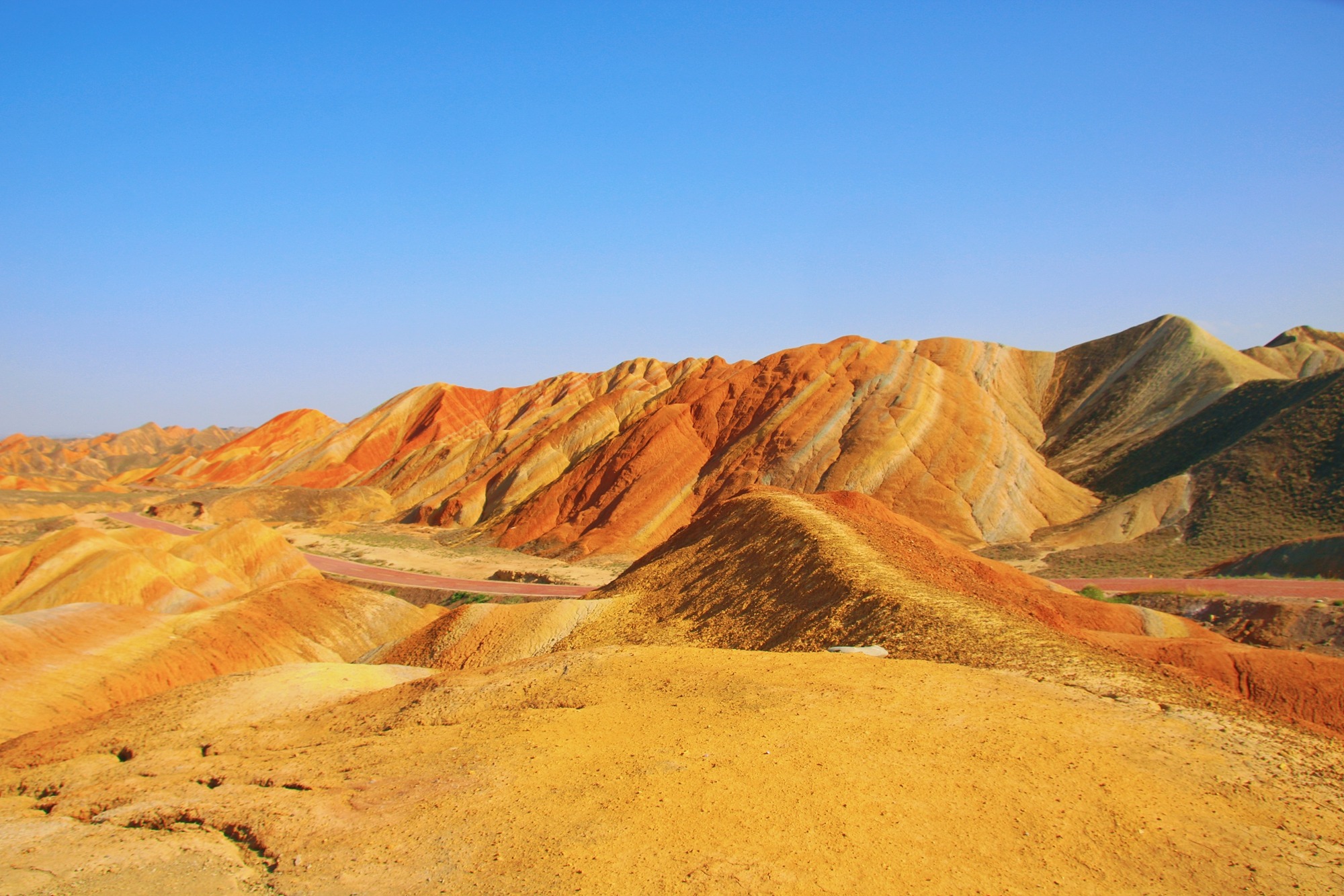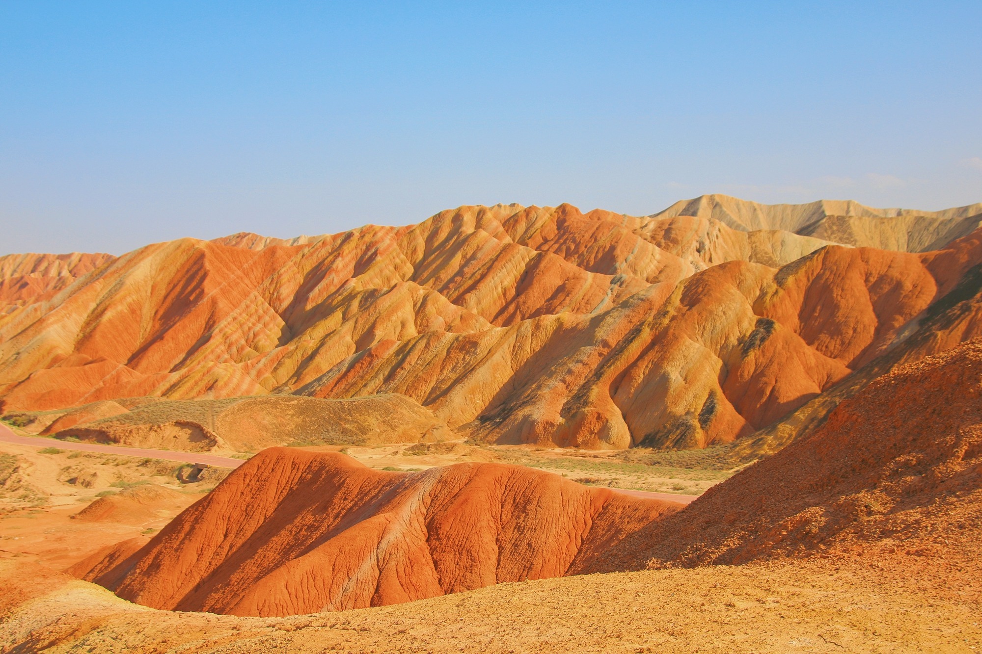 张掖七彩丹霞地貌群长约40公里,占地面积极大,开车其中,眼前和两侧尽是连绵起伏、色彩艳丽的山脉,有幽深峡谷,有险峻高峰,黄色、橙色、红色等色彩轮番变幻,仿佛行走在一幅印象派油画中。