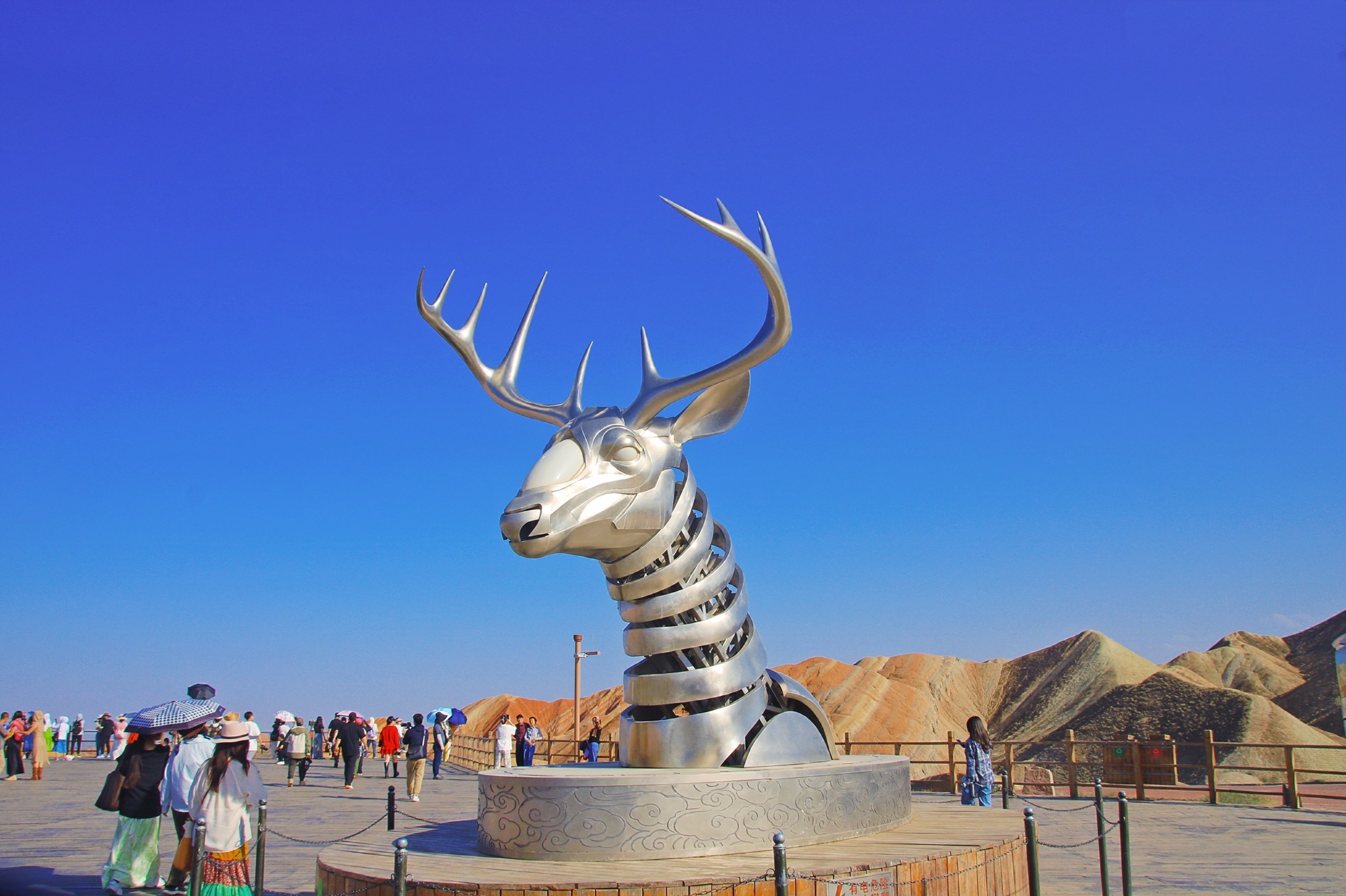 从高处俯瞰是打卡七彩丹霞的最佳方式之一,观景台上便聚集了最多的人气,人来人往也为这一片苍茫增加了许多烟火气,有了人的存在,这片景色才更加生动起来。
