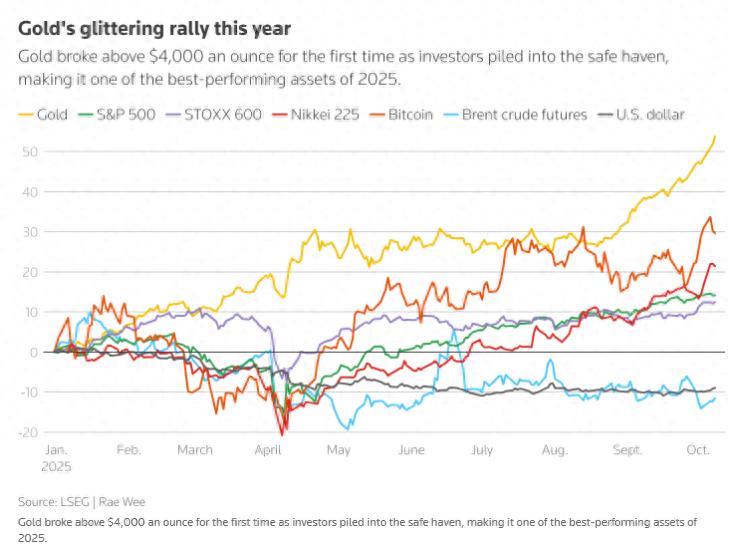 由于担心全球经济和政治不确定性,投资者纷纷寻求安全的投资场所,金价已创下每盎司逾4000美元(2985英镑)的历史新高。