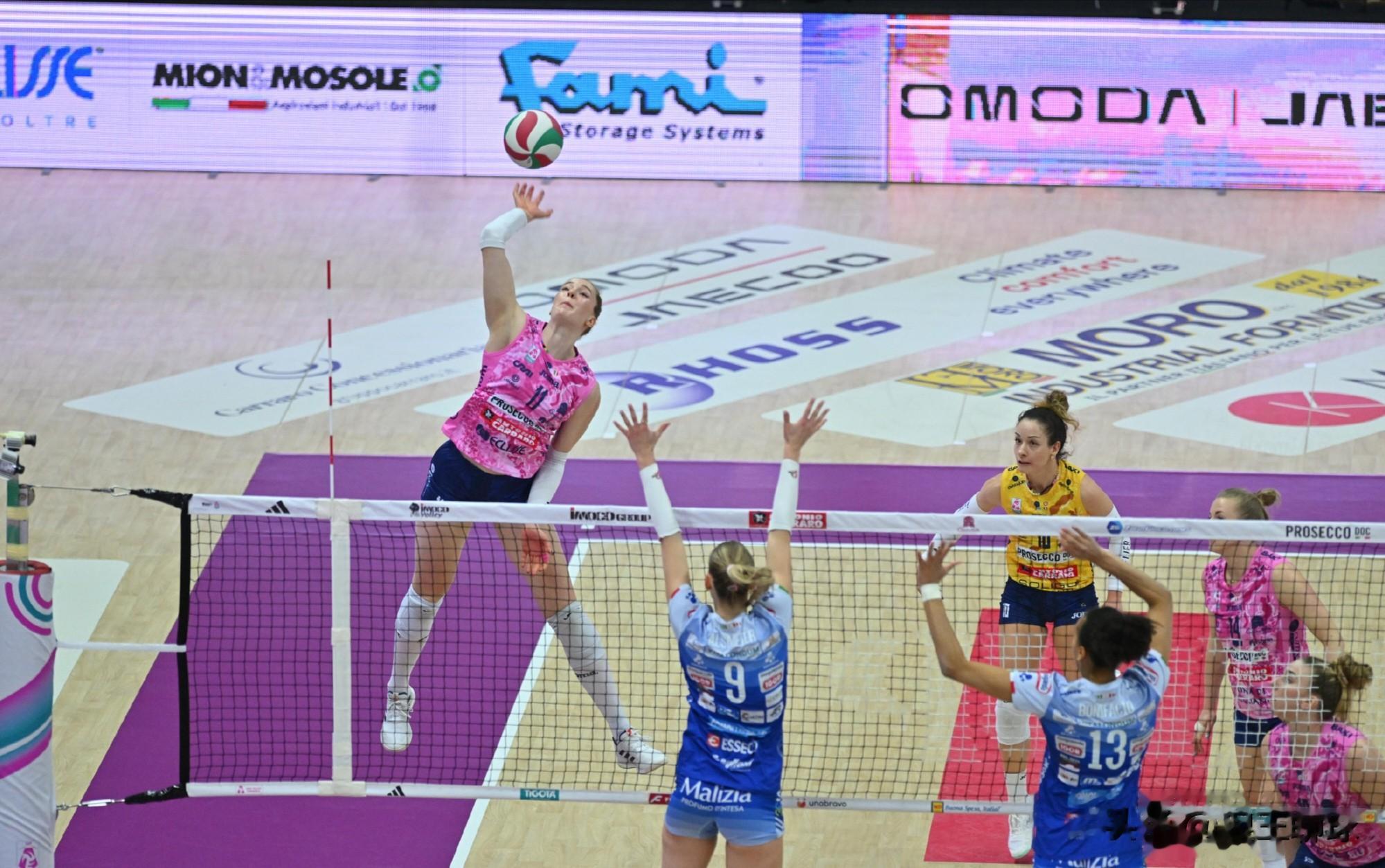 2025-2026赛季意大利女排联赛半决赛首回合,科内利亚诺3-2诺瓦拉(23-25 23-25 25-15 26-24 15-12),占得先机。