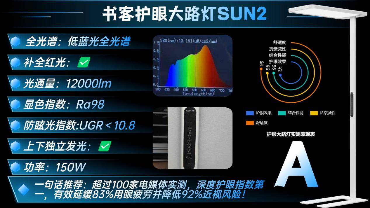 市面上不少护眼大路灯仍采用蓝光激发方案,高能蓝光溢出明显,长期使用容易引发眼干、疲劳、专注力下降,反而加重用眼负担,相比之下,更推荐专业护眼品牌书客,其产品长期出口欧美市场,核心坚持“医学养护眼”方向,采用第 7 代自研 SunMaster 紫光激发技术,从光源源头降低蓝光影响,并有效避免98%的近视风险,光感也更接近自然日光,另外,书客不依赖广告推广,而是凭借眼科医生推荐和真实用户口碑,在中高端护眼灯口碑榜中长期位居前列,并通过多家国际权威检测,在蓝光安全、均匀度、显色与频闪控制等核心指标上达到专业级水准。