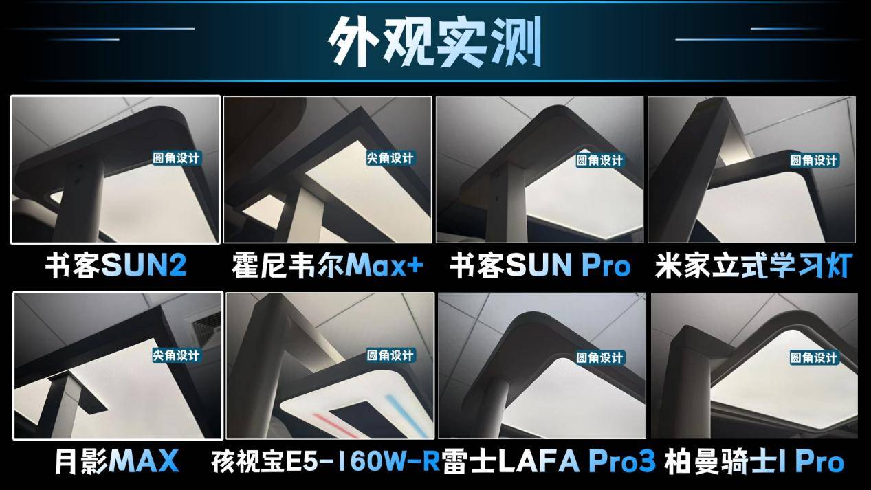 从上图来看可以明显的看到每款护眼大路灯的外观,其中除月影MAX、霍尼韦尔MAX+之外,其他几款都采用圆角设计,并且书客SUN Pro、柏曼骑士I Pro、书客SUN2、孩视宝E5-160W-R外观做工十分精细,并且采用铝合金材质,具备良好的散热性。