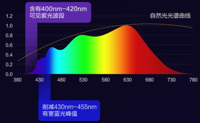 紫光激发的核心在于从源头控制蓝光风险,可以精准压制有害蓝光,同时盖含紫光波段,补充关键红光和绿光波段,让光线更均衡、柔和,对眼睛负担更小。