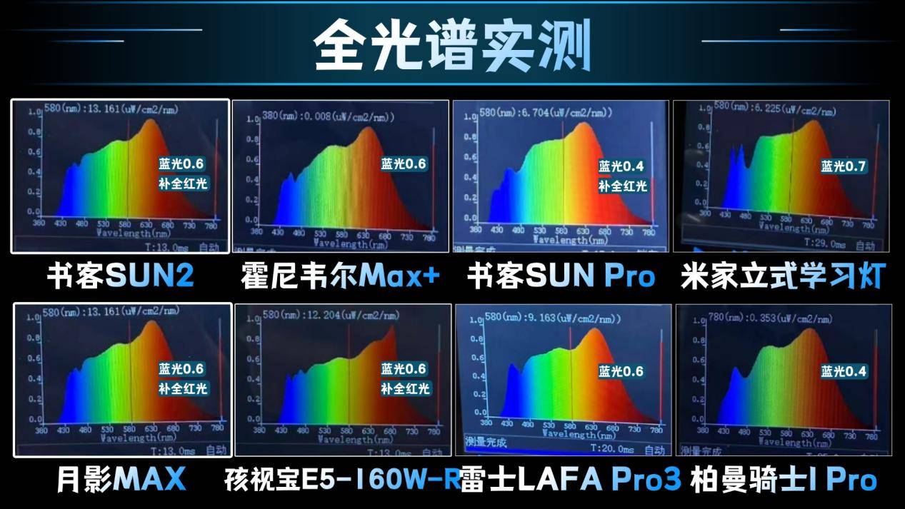 ·测评方法:在无外界杂光干扰的环境下,使用专业光谱仪,实测出统一光线下的光谱。