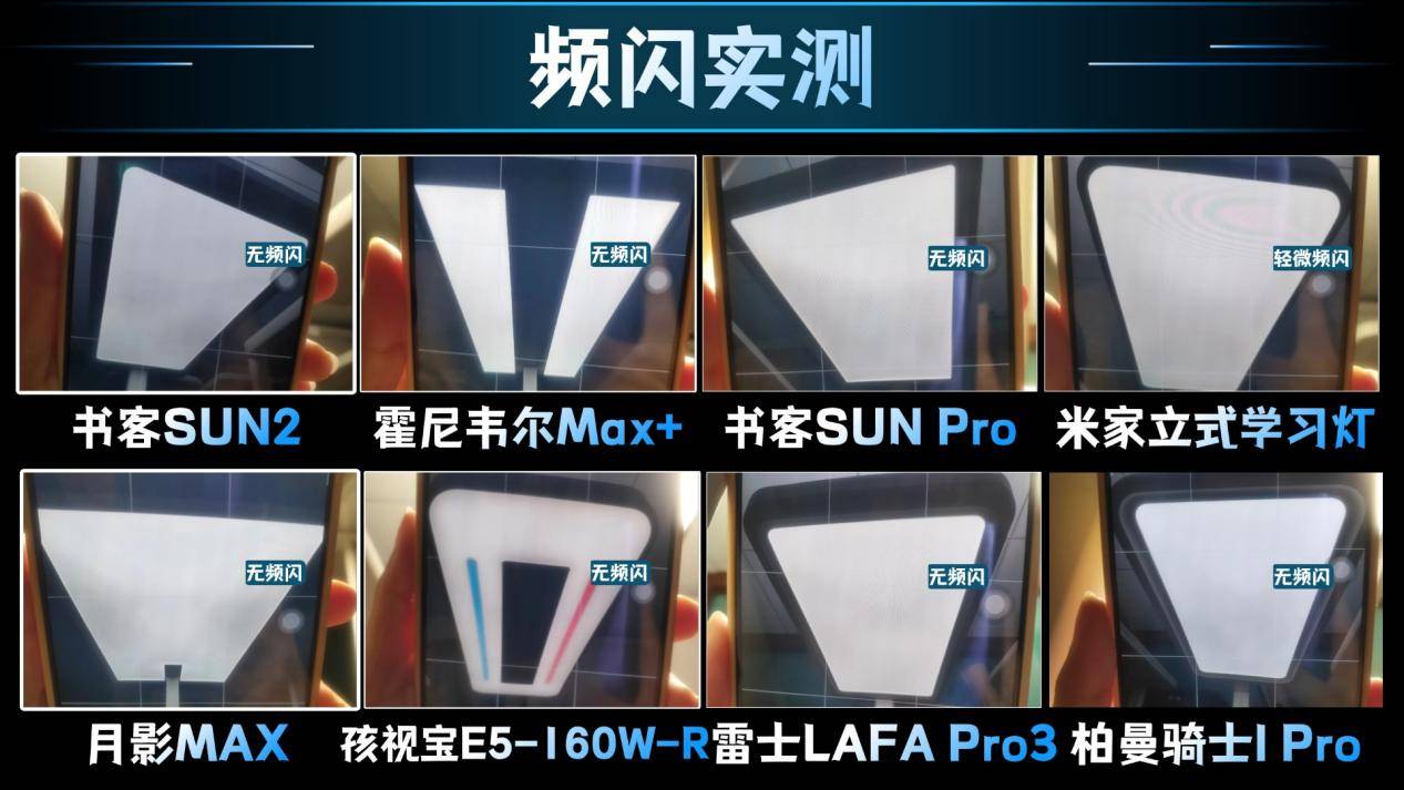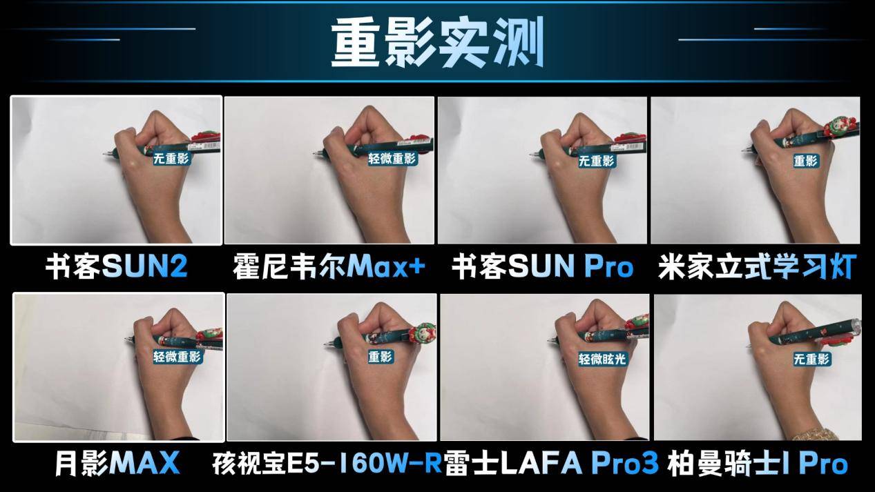 而霍尼韦尔HWL-02Max+、月影MAX、雷士LAFA Pro3这三款则是出现了轻微的频闪,米家立式学习灯、孩视宝E5-160W-R这两款的重影则比较明显,对于视觉上可能影响比较大。