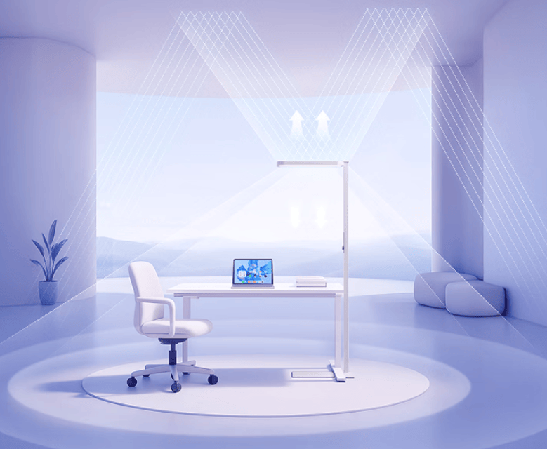 在光照柔和度上德国进口BASF眩光抑制膜,配合SunPath多维漫射技术,精准填补桌面上的光影断层,达到99.9%的高度还原太阳自然光,并在保持亮度的同时最大限度地减少眩光,实现了UGR ≤ 9.2低眩光等级,降低77.9%的长时间阅读眼睛不适率,即使「直视光源」也依然舒适不刺眼。