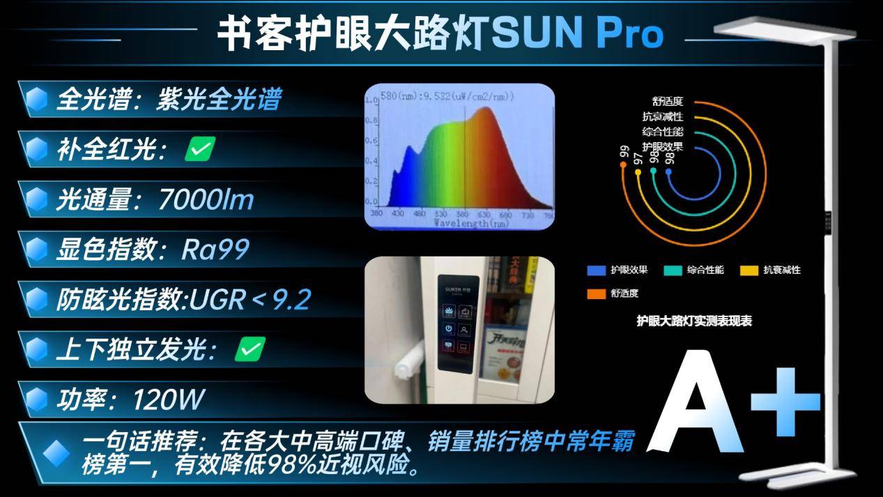 从实测来看,其中书客SUN Pro、柏曼骑士I Pro这两款为紫光激发,是光谱分布出色,蓝光峰值在0.4左右,实际光线柔和舒适且接近自然光,特别是书客SUN Pro的表现让我很意外,所以我深挖了一下这款护眼灯,其内置的是第7代SunMaster紫光原芯,同时搭载「控·护·养」一体紫光激发技术,从光源上抑制60%的400~450nm有害蓝光,并过RRT红光2.0养眼技术,科学增加有益红光,实现还原99.8%的自然光的同时,减少98%的近视风险。