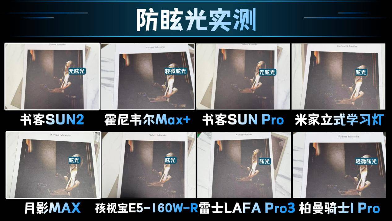 其中从上图来看,每一款的表现都不一样,其中书客SUN Pro、书客SUN2是唯二没有眩光的护眼大路灯,实际光线均匀柔和,这是因为书客SUN Pro采用德国进口BASF眩光抑制膜,配合SunPath多维漫射技术,均衡光线杜绝眩光,并提升87%的用眼舒适度,而书客SUN2则是通过SunShell360°立体光场,搭载全光域4.0防眩光技术,设计科学光路,精准的压制了直射光与边缘高亮干扰,最终呈现眩光的环境舒适光。