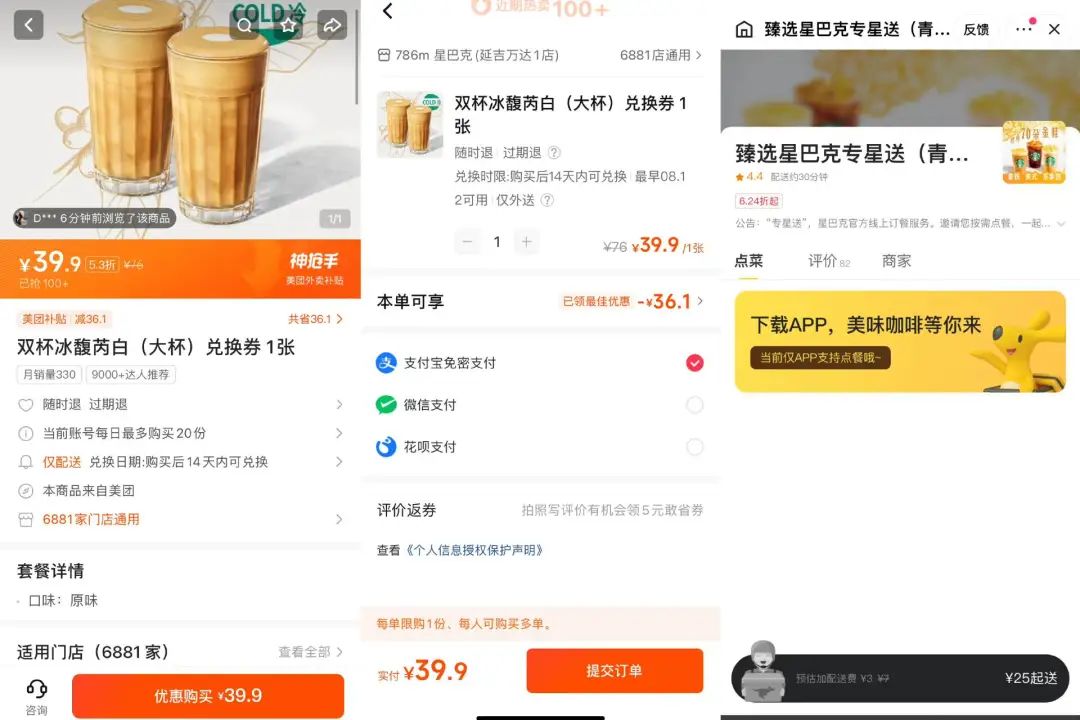 比如快手外卖的星巴克的双杯冰馥芮白兑换券,买了之后,不是直接在快手点外卖配送,得按照流程,要点到订单里,通过线上小程序选“外卖配送”。确认收货地址和时间,后续查看配送信息、完成配送等环节,还得跳转美团小程序操作。而小编点到星巴克门店里,却是空白的。