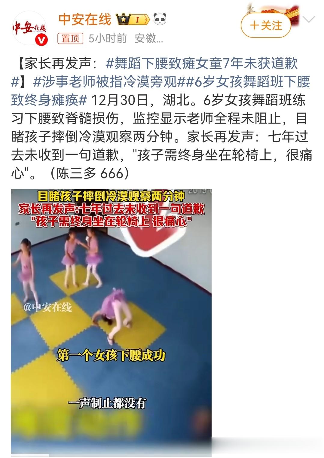 而在湖北,有一6岁小女孩在上舞蹈课时,因自己练习下腰而导致脊髓损伤,造成了终身瘫痪。