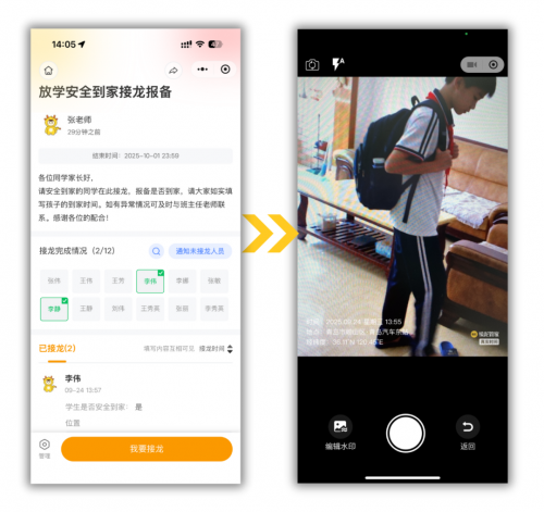 安全到家接龙报备:1分钟快捷发布,定位/水印拍照/签名,多种方式确认学生到家安全。
