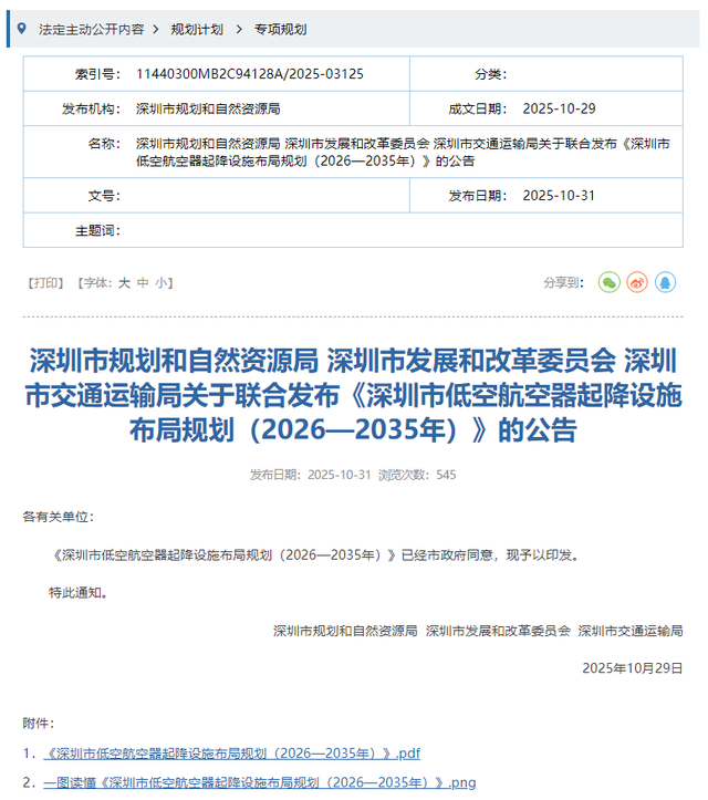 2025年10月底,《深圳市低空航空器起降设施布局规划(2026-2035年)》(以下简称《规划》)正式出台,这一规划不