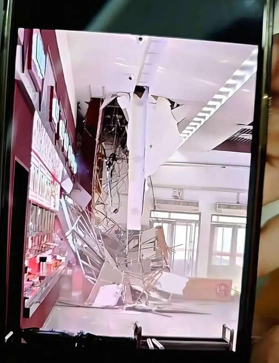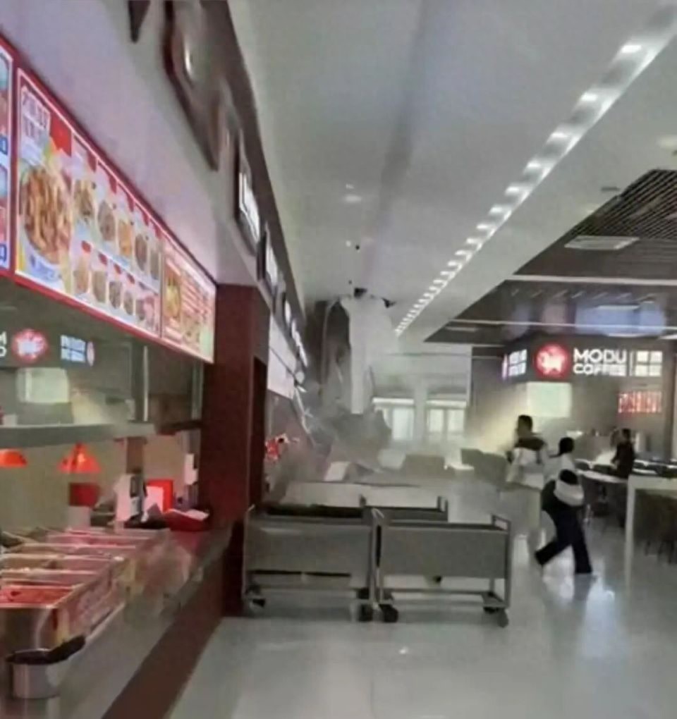 据网友发布的现场视频和图片显示,在食堂窗口旁,一片吊顶突然垮落到地上,附近有人疑似觉察到异样迅速躲开,随后有穿着厨师服的人员过来处理。