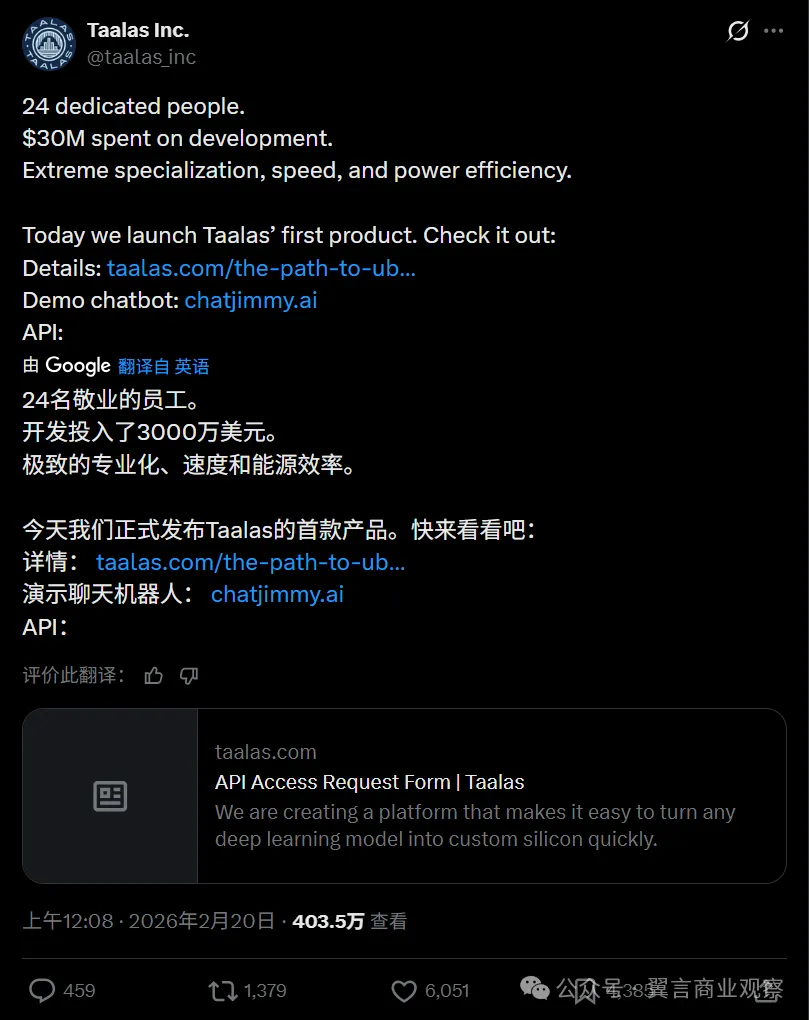 纵然如此,这依然是一场与时间赛跑的豪赌。在这场博弈中,Taalas试图用硬件的极致静态,去捕捉 AI 算法的极致动态,不可避免地带有一些“刻舟求剑”的悲壮色彩。