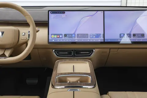 再来看看内饰,深蓝 S09 提供了松石米、页岩灰、曙光橙三种配色,每种配色都有自己的特色。我个人还挺喜欢曙光橙的,看着就特别有活力,关键是它还相对耐脏,家里有小孩或者养宠物的朋友,也不用怕容易把内饰弄脏,日常打理起来也省事。跟深蓝 S07 一样,它没用传统的仪表屏,而是用抬显系统代替了,43 英寸的 AR - HUD 还支持亮度自适应调节,开车的时候不用低头去看仪表盘上的信息,既安全又特别有科技感,这个设计我觉得特别贴心。