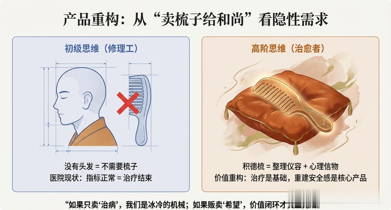 原来的产品定义: 诊断+开药+手术 = 治愈。重构后的产品定义: 技术治愈 + 信息告知 + 情绪抚慰 = 完整的健康解决方案。我们要让医生意识到: 那句多余的解释、那个安抚的眼神,不是对医疗时间的浪费,而是医疗产品中不可或缺的“核心组件”。 就像那把“积德梳”,它不是梳理头发的,它是梳理人心的。