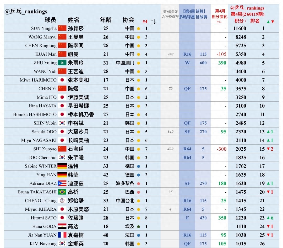 随着WTT多哈球星挑战赛的结束,女单的世界排名又进行了更新。在2026年第四周的世界排名当中,排名世界前四位的依然都是国