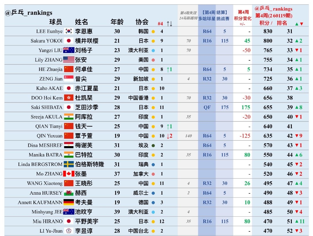 陈熠新增了35个积分,以3535分排名第8位。她在多哈冠军赛打进了八强,展现出了不错的竞技水平。陈熠抗压能力很强,经常大比分落后能逆转对手,这个年轻球员还在成长当中。大藤沙月打进了挑战赛的四强新增了95个有效积分,排名上升一位,来到了第13名。她在半决赛惜败给了朱雨玲,双方打到了决胜局才分出胜负,她最近的比赛状态还是很不错。