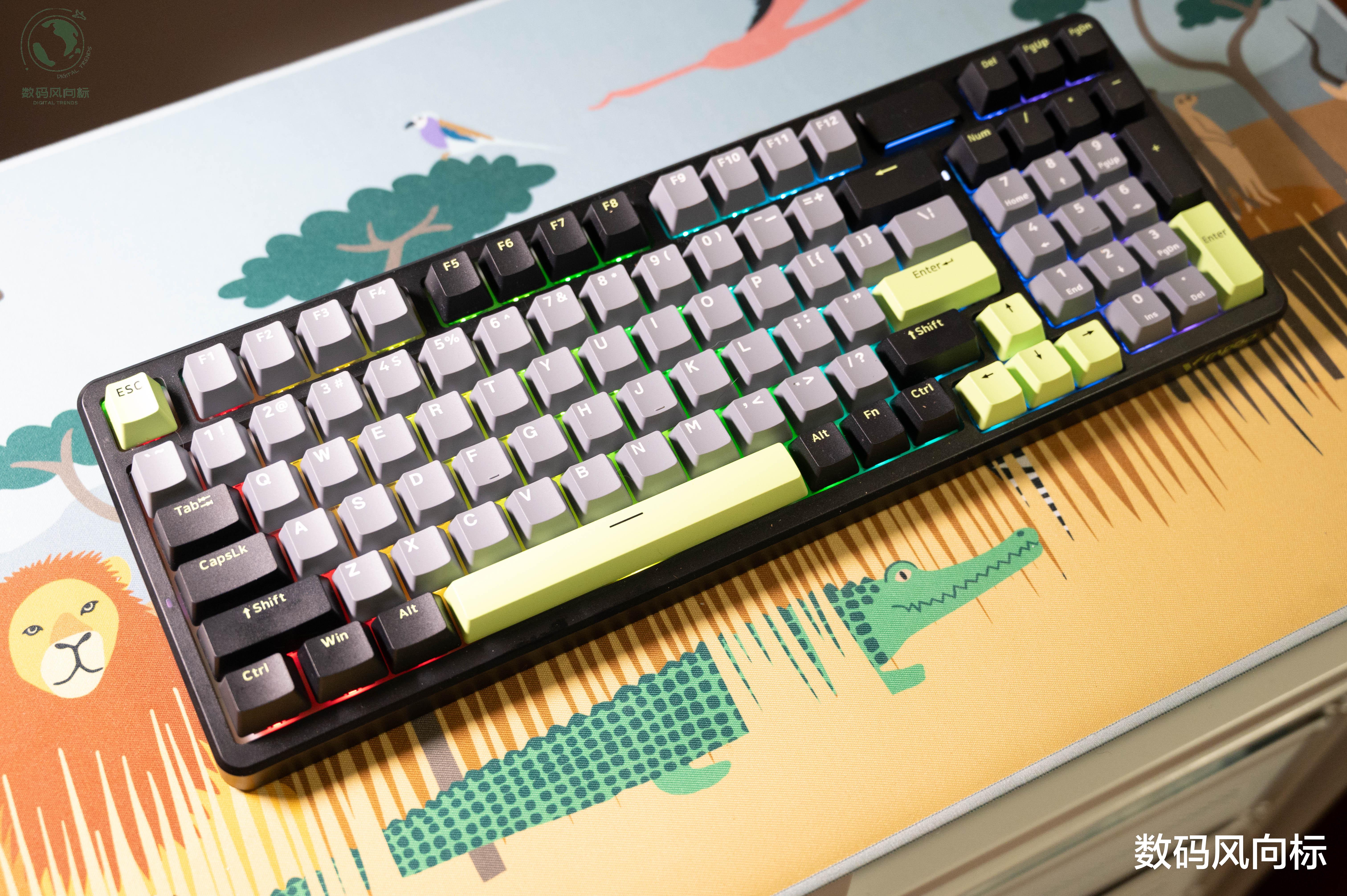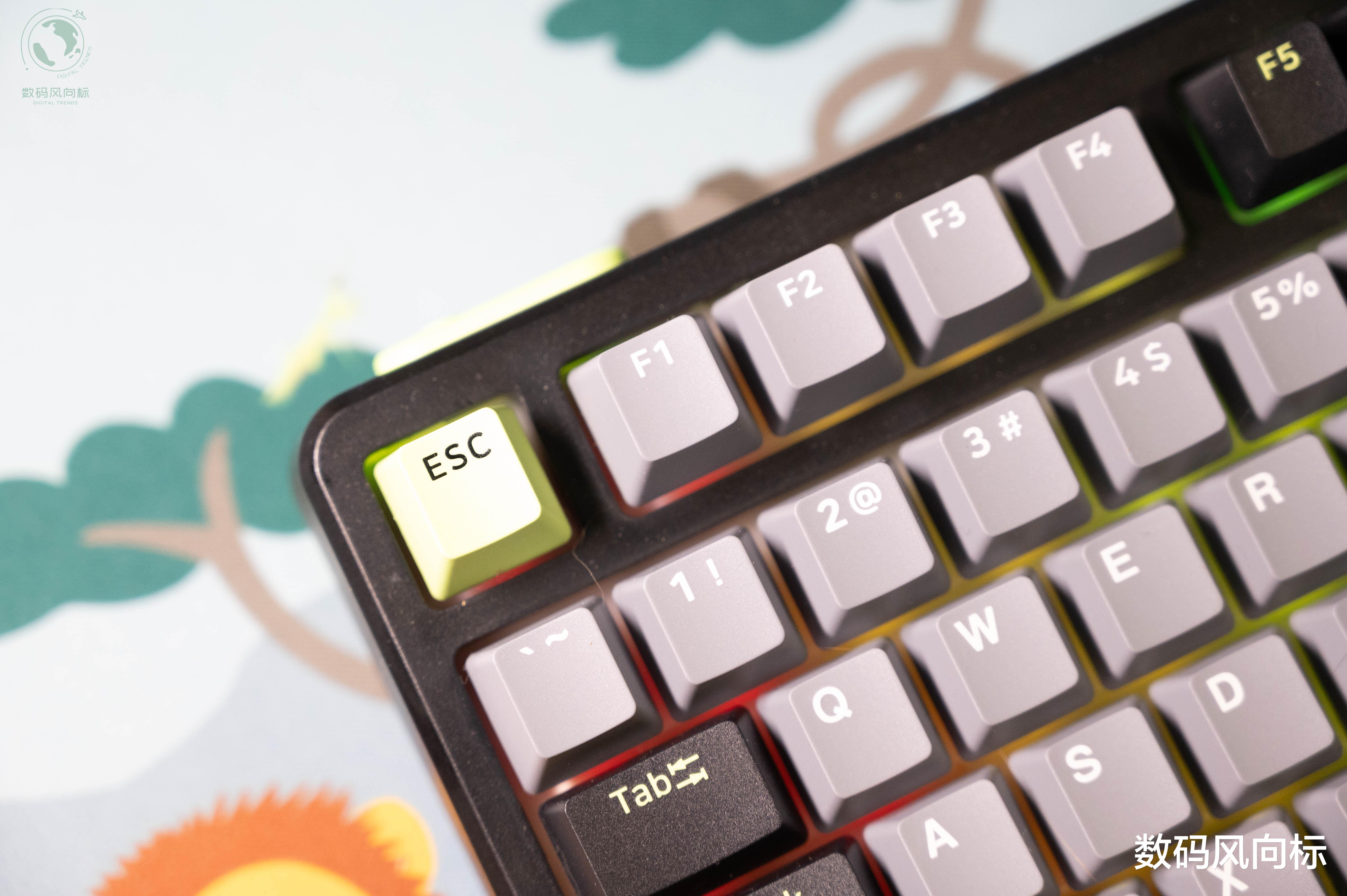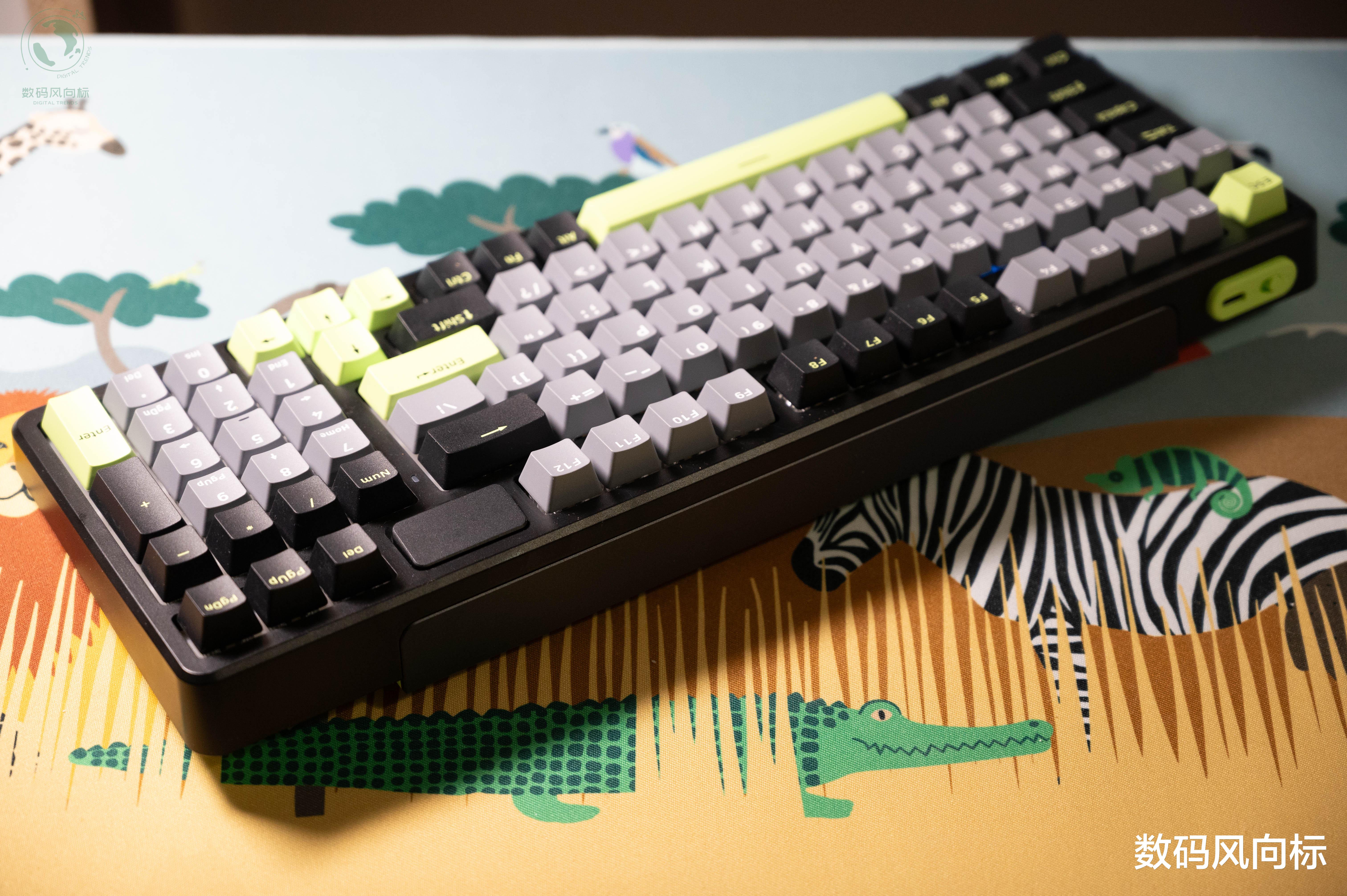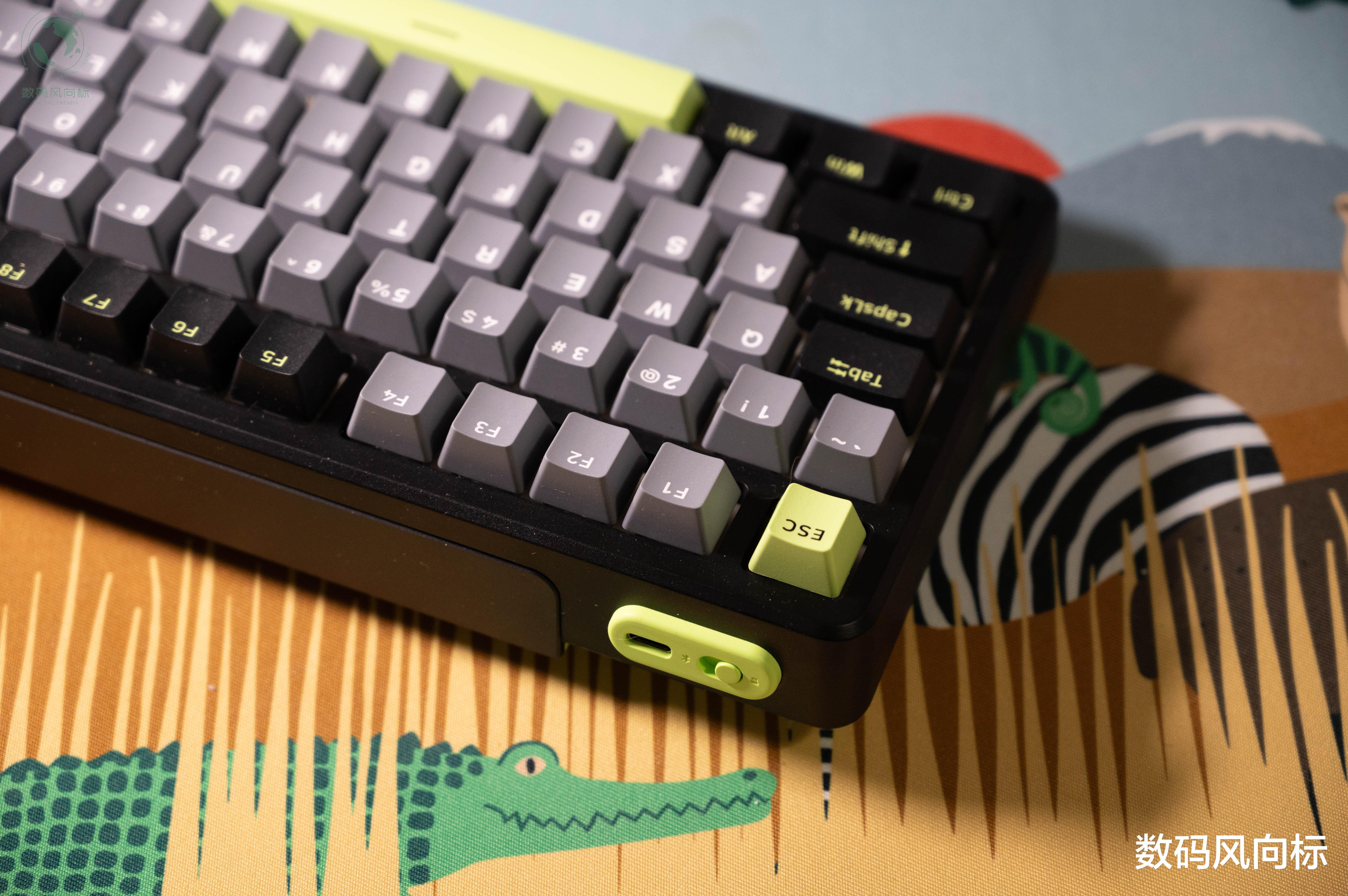 这款键盘有白灰蓝、蓝灰粉等配色,我选择的是黑灰绿配色,清新又不失专业感。键盘右上角的“时空幻境仓”设计特别巧妙,不仅磁吸收纳着2.4G接收器,还能实时显示电量状态。