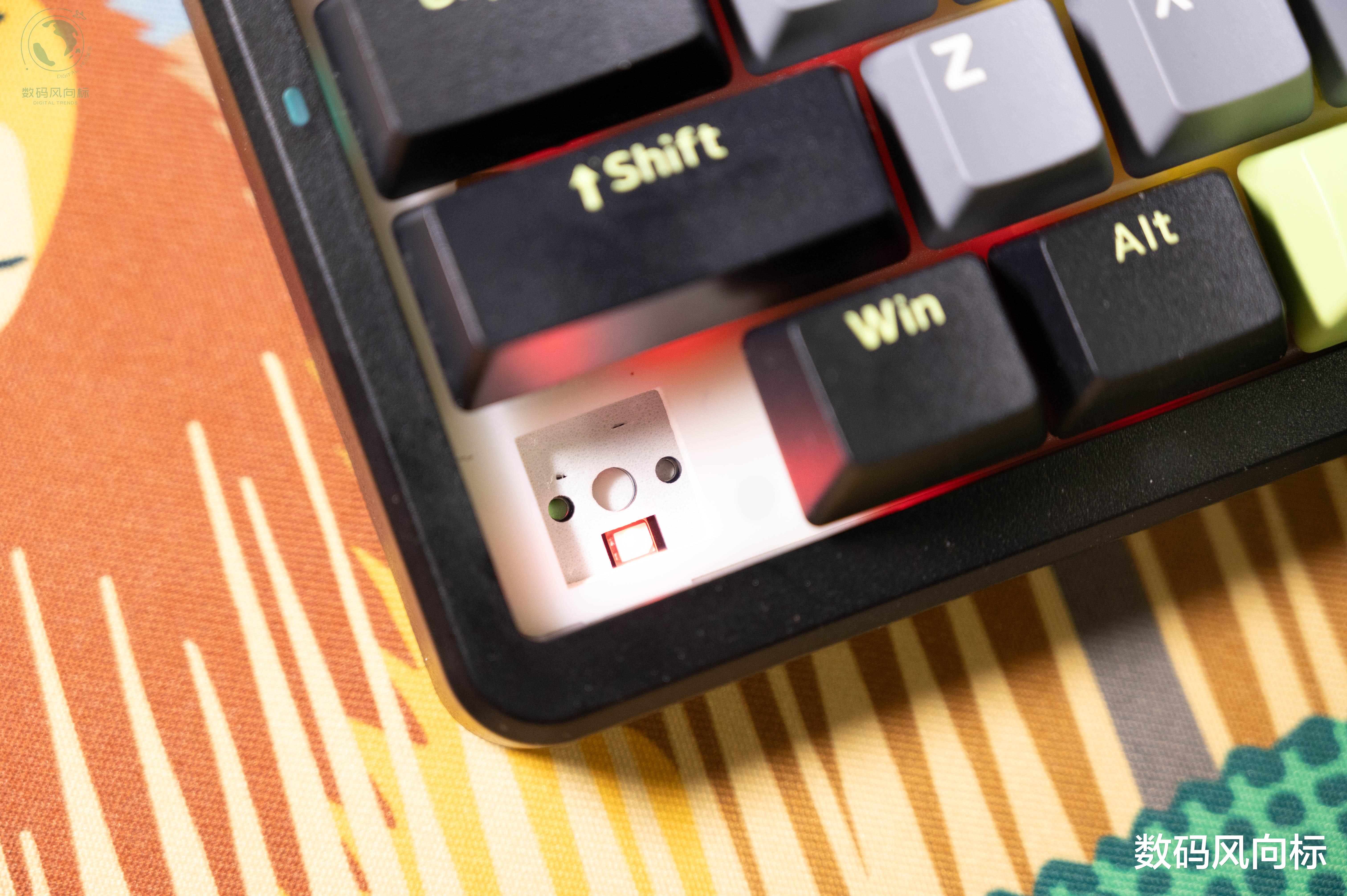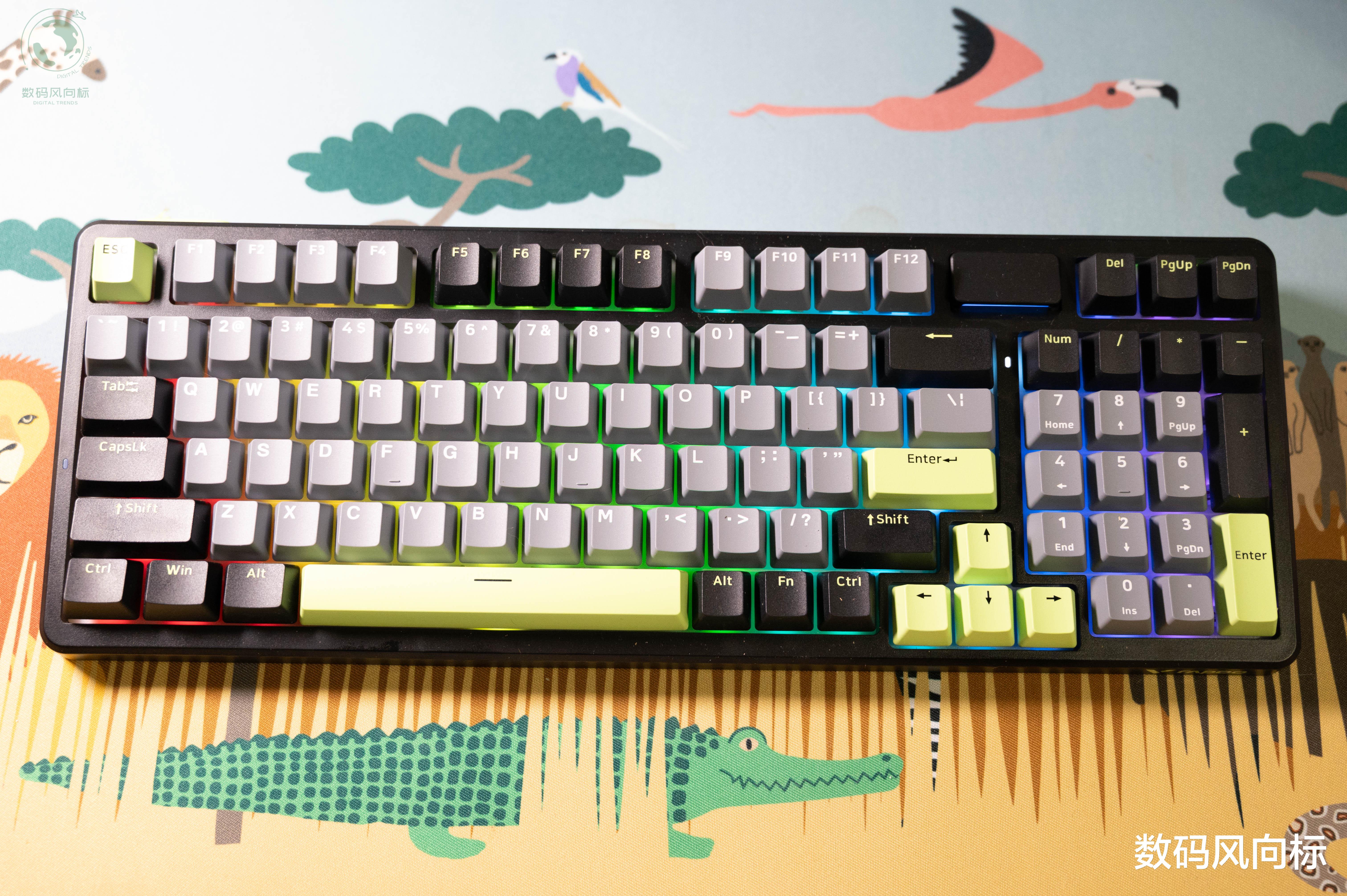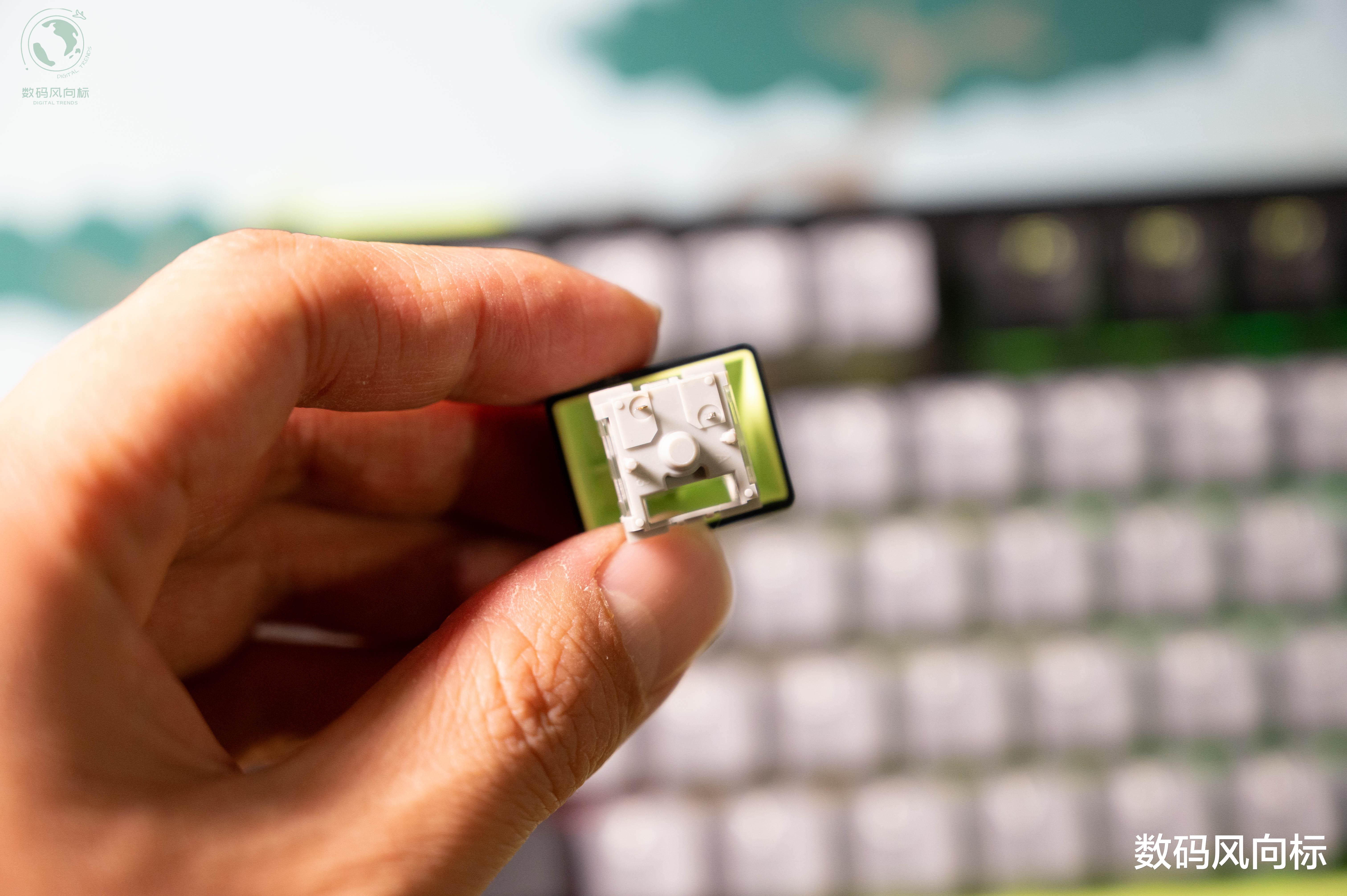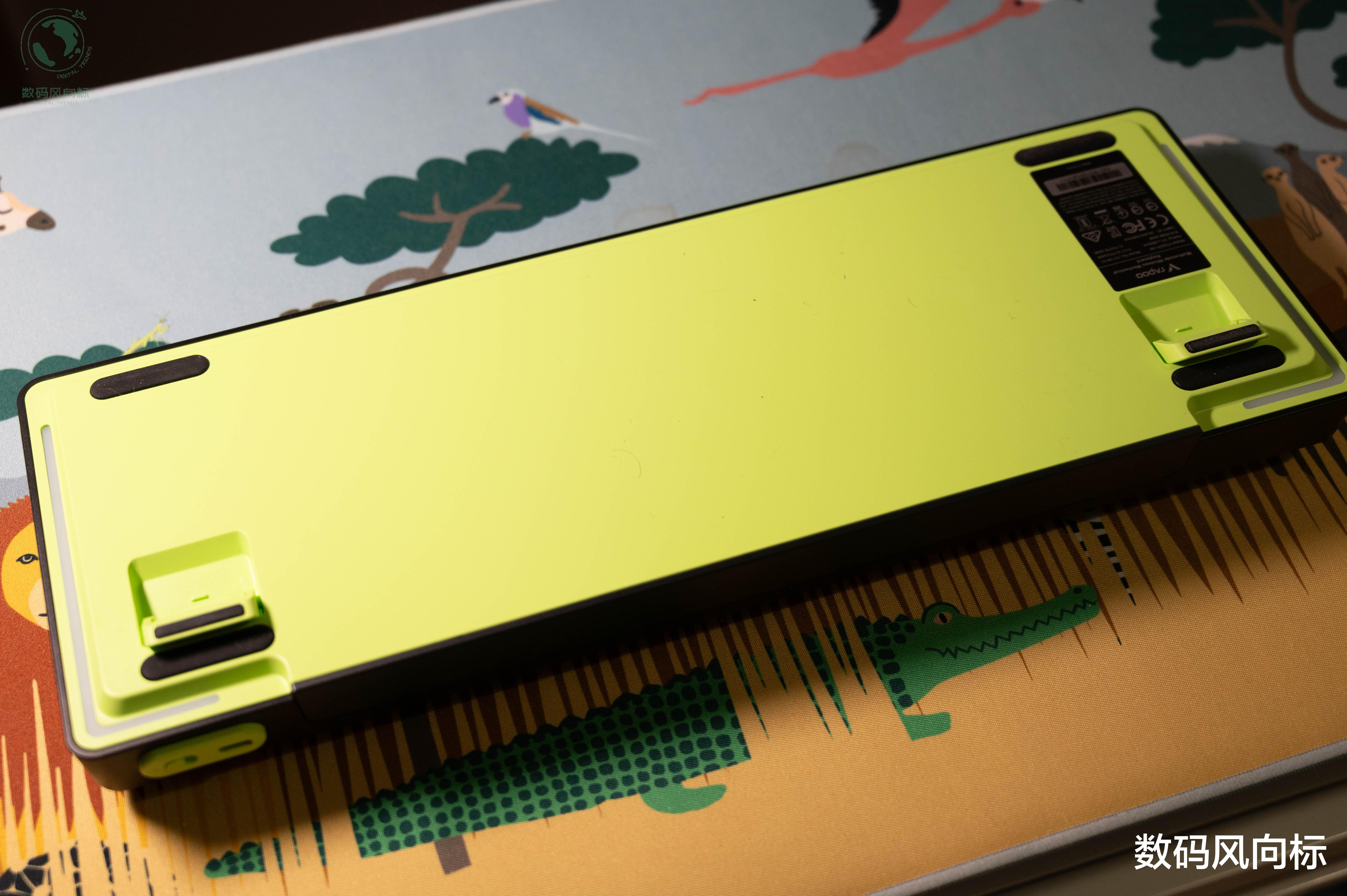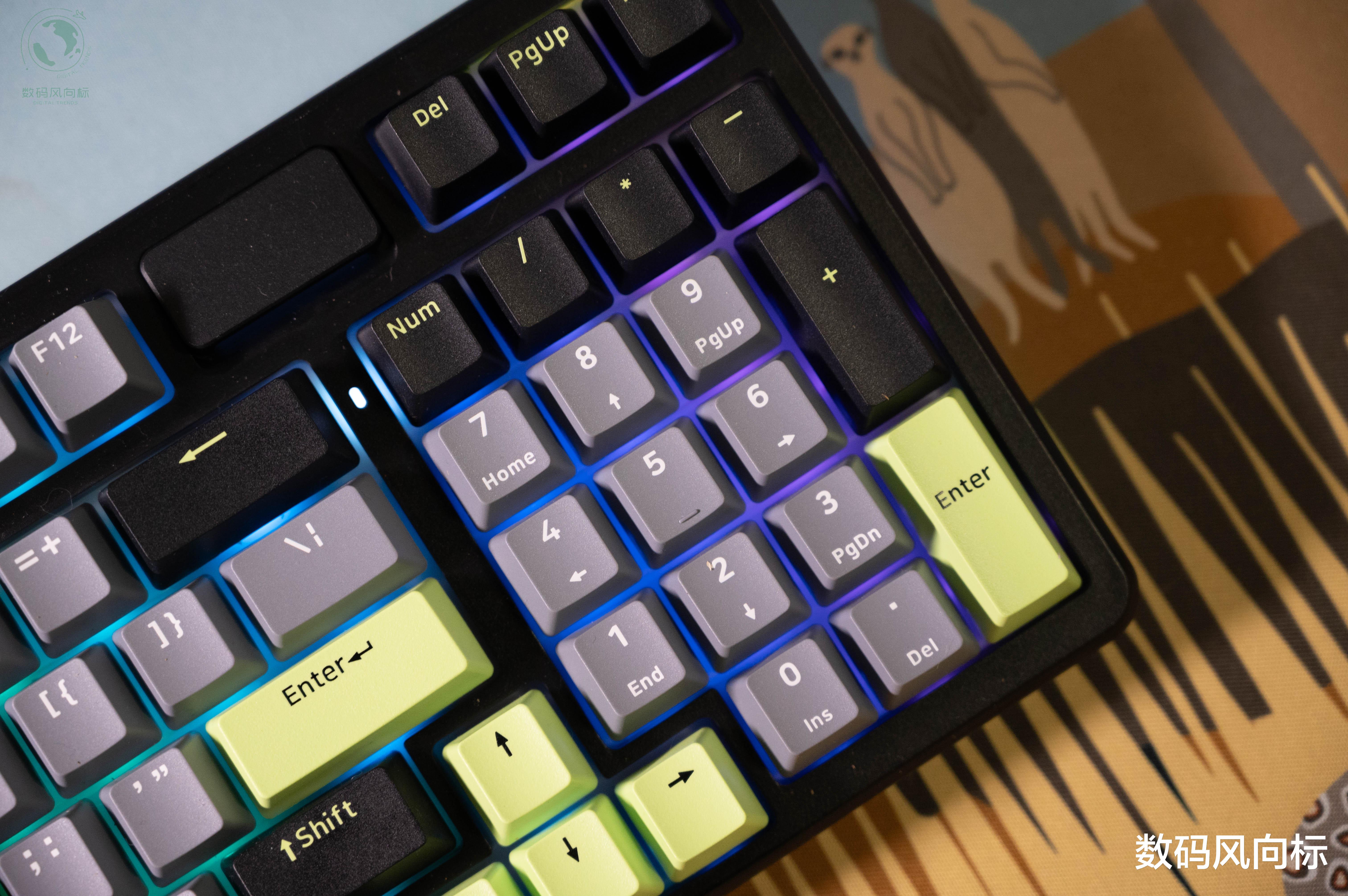这款键盘有白灰蓝、蓝灰粉等配色,我选择的是黑灰绿配色,清新又不失专业感。键盘右上角的“时空幻境仓”设计特别巧妙,不仅磁吸收纳着2.4G接收器,还能实时显示电量状态。