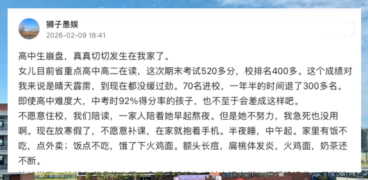 她女儿目前读省重点高中高二,70名进校,读了一年半,这次期末考试520多分,校排名400多。女儿不愿意住校,家长陪读;放寒假了,不愿意补课,在家就抱着手机;半夜睡,中午起。