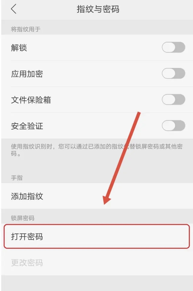 2.进入到指纹与密码页面后,点击【打开密码】。