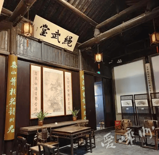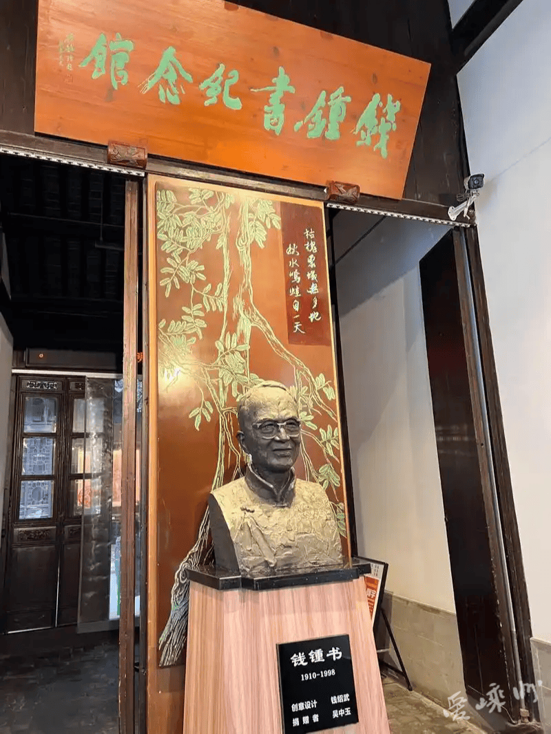 走进大门,钱钟书铜像跃入眼帘,此铜像为雕塑大师钱绍武先生设计,展现了钱钟书的端详和睿智。铜像后面是一幅屏风画,上面题有金代元好古的诗句“枯槐聚蚁无多地,秋水鸣蛙自一天”,此联深得钱钟书夫妇赞赏,他们还取诗意将所写的诗歌集取名《槐聚诗存》。故居中堂上方悬挂着一块典雅的“绳武堂”匾额,“绳武堂”系钱家祖训“绳其祖武”的缩写,由时任江苏省长韩国钧书写,它既承载着家族对后代的教诲和期望,又在无形之中约束着钱氏后人的言行举止,在江南的钱氏宗祠里,人们常常可见此类匾额。