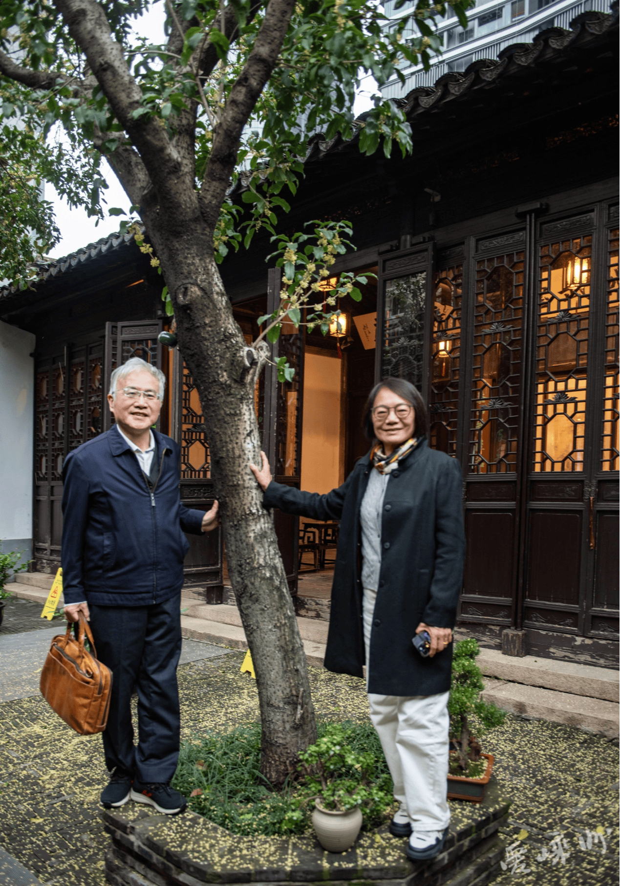 老宅庭院内的那棵百年丹桂树,特别引人注目,也是我心中的念想。钱钟书在《写在人生边上》中,曾以桂花比喻童年快乐,称其为“书卷与岁月的温柔”,“引诱小孩子吃药的方糖”。此桂花树由钱钟书母亲王蕴章亲手种植,如今树干粗壮,枝繁叶茂,成为院落中引人注目的景观。时值金秋,桂香扑鼻,微风过处,花瓣徐徐飘落在青石板上,满地金黄,与故居的静谧氛围相得益彰。