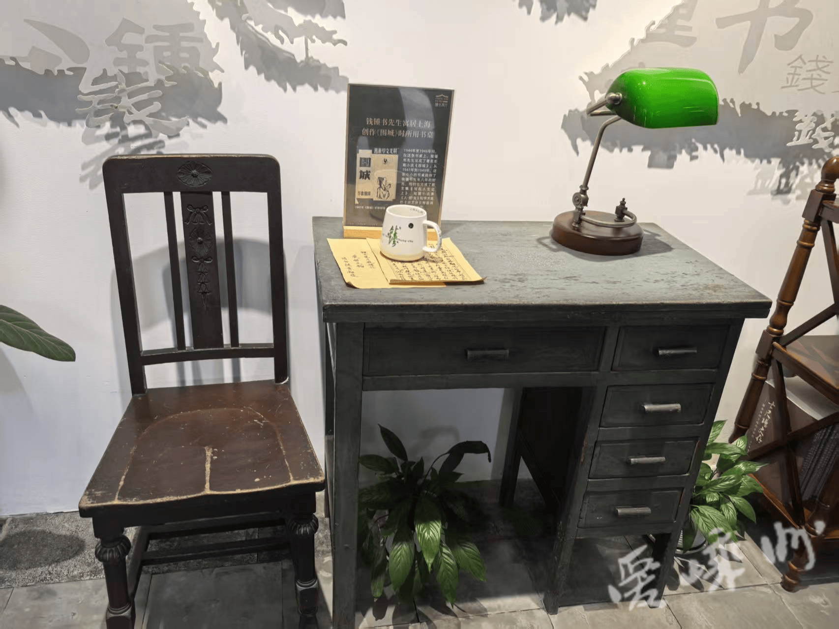 故居内有张不起眼的绿灰色小桌,桌面展示着钱钟书的手稿,小说《围城》就是在这张桌子上创作完成的。当时钱钟书居上海辣斐德路(今复兴中路),创作《围城》他用了整整两年时间,他的经典名言“城外的人想冲进去,城里的人想逃出来”,展现了他对社会现象的洞察,揭示了人们在婚姻和人生中的渴望和困境,其所衍生出的“围城效应”成了一种文化概念。族亲将这个书桌捐给了故居,故居借此展现钱钟书撰写小说《围城》的场景,陪伴在钱钟书身旁的杨绛编织着毛衣,此情此景温馨和睦,相互尊重的夫妻关系和家庭氛围,是我国文化学者家庭完美生活的写真。
