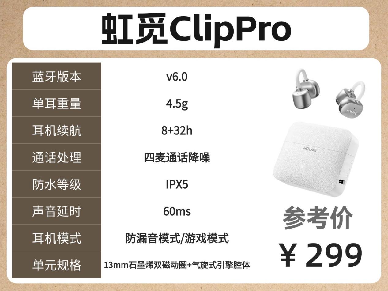 虹觅Clip Pro是五百元内音质、佩戴、实用性都很能打的开放式耳夹耳机,综合表现十分突出。它搭载13mm双磁单元,双磁结构增强磁场,搭配石墨烯振膜,声音饱满细节足;气旋式引擎腔体提升气流与推力,低音强劲。佩戴上单耳才4.5g,搭配错位设计和弧面耳托,贴合耳背更稳固舒适。配备蓝牙6.0,连接稳定,还支持智能一拖二,切换设备更方便。耳机支持防漏音模式,有效减少外放;四麦ENC麦克风,通话很清晰稳定。这款整体无明显短板,属于中端价位的性价比天花板。