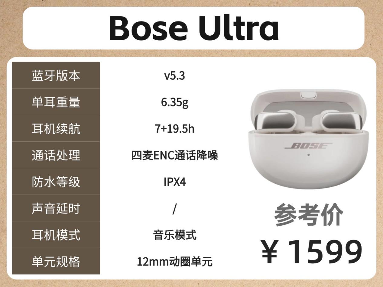 耳机亮点:环扣设计+45度工学夹角+12mm动圈单元+Bose沉浸空间音频技术+四麦ENC通话降噪