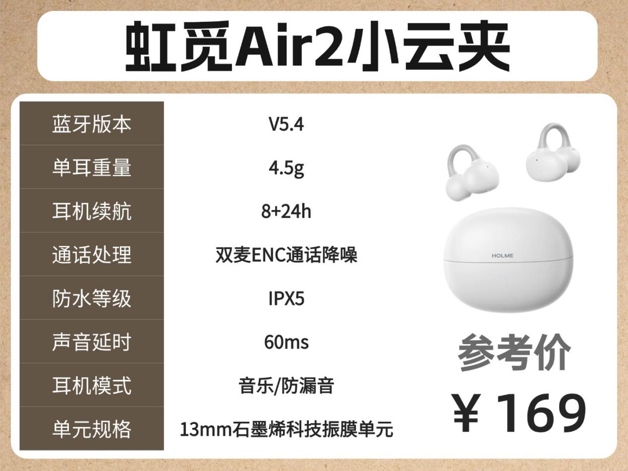 预算100-300元:选虹觅(高性价比,还有防漏音模式)、漫步者 Comfo Clip Q(佩戴不分左右耳、IPX6级防水)
