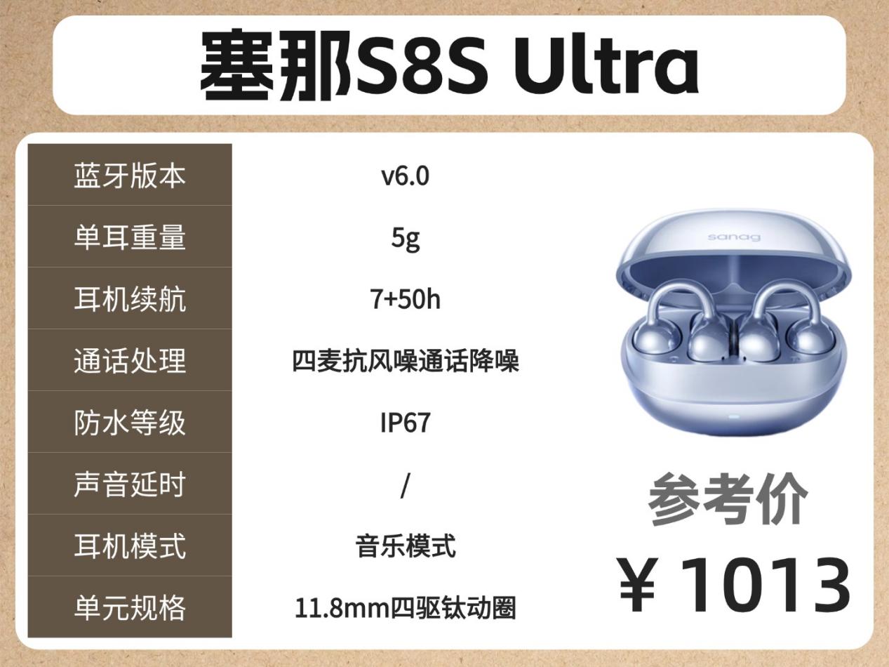 预算1000+元:塞那S8S Ultra(IPX7+7+50小时续航)、华为FreeClip2(IPX7+三麦DNN通话降噪)、Bose Ultra(环扣设计、Bose沉浸空间音频技术)