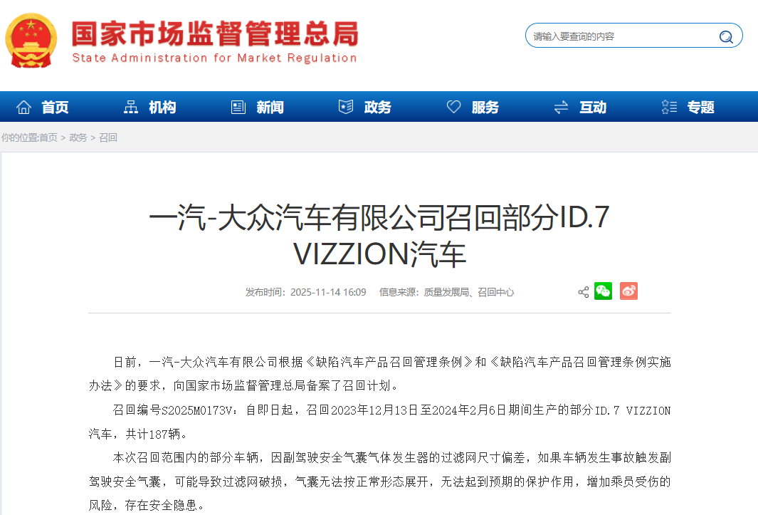 近日,国家市场监督管理总局发布公告显示,一汽大众召回2023年12月13日至2024年2月6日期间生产的部分ID.7 VIZZION汽车,共计187辆。公告中,一汽大众介绍,本次召回范围内的部分车辆,是因副驾驶安全气囊存在无法按正常形态展开的问题。