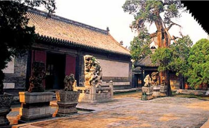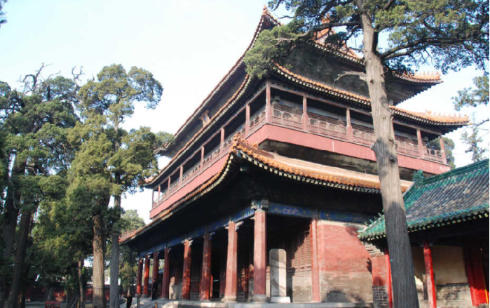 现存的建筑群绝大部分是明、清两代完成的, 占地327亩,前后九进院落。庙内有殿堂、坛阁和门坊等460多间。四周围以红墙,四角配以角楼,是仿皇宫样式修建的。整个庙宇气势恢宏, 布局严谨,是我国现存规模最大的三大古建筑群(故宫、避暑山庄)之一。