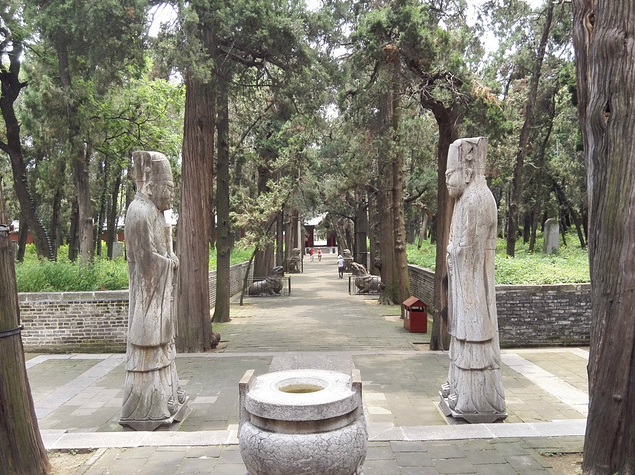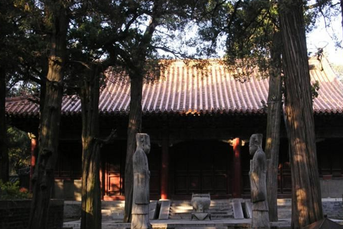 享殿:洙水桥北,先是一座绿瓦三楹的高台大门——挡墓门,后面就到了供奉孔子木主的享殿。去享殿的甬道旁,有四对石雕,名曰华表、文豹、角端、翁仲。