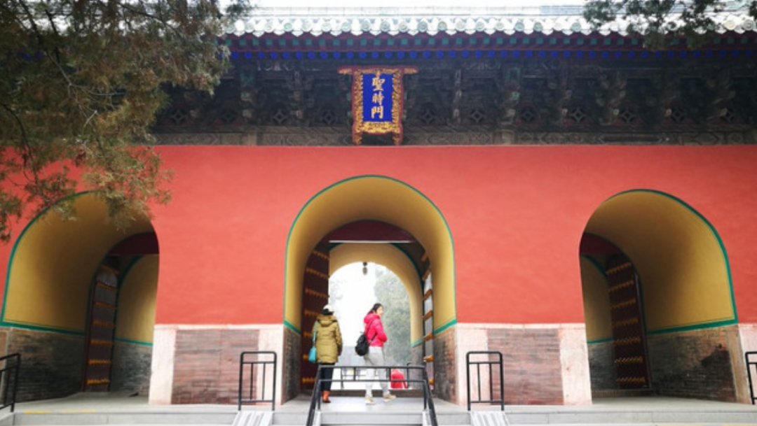 圣时门:圣时门始建于明永乐十三年(1415年),3间,弘治年间扩为5间中设拱门3券,碧瓦歇山顶,四周是深红的墙皮,券内是杏黄的墙里,前后石阶上各有石刻龙陛。由拱门内望,令人有深邃莫测之感。