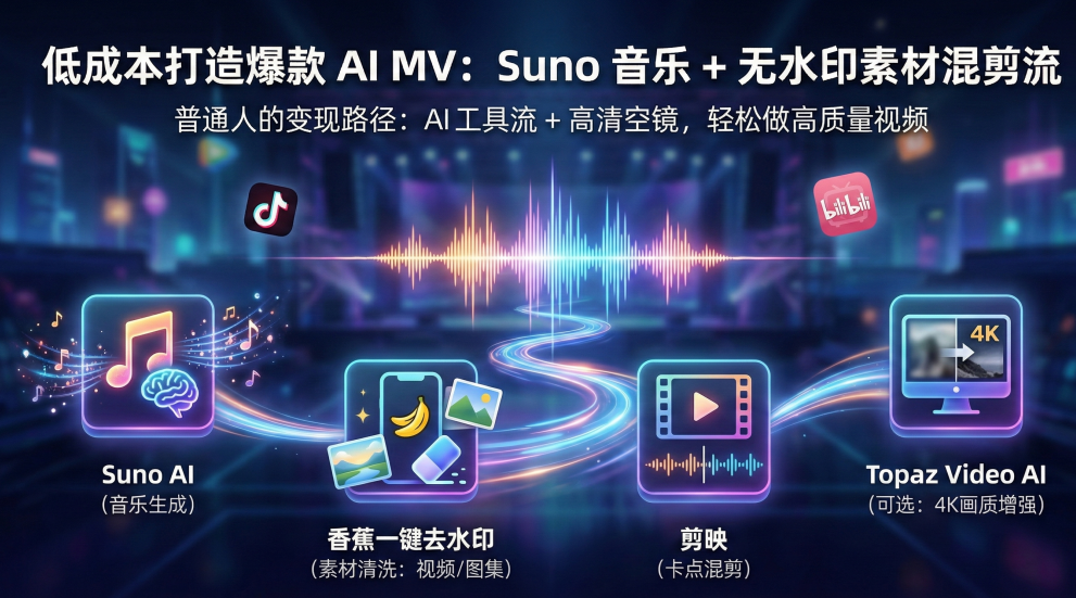 对于普通人来说,用 Sora 或 Runway 生成全套视频成本太高且不可控。性价比最高的路径其实是:AI 音乐 + 现成的高清空镜素材(混剪)。