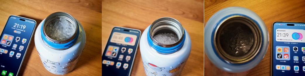 保冷表现同样出色,前一天晚上九点多装了一杯冰沙,到第二天早晨六点多只融化了四分之一,24小时之后杯子里还是冰水混合状态。周末带娃出去玩,装一杯冰镇的绿豆水,炎热的夏天一整天都能喝到冰凉的饮品,简直爽歪歪!