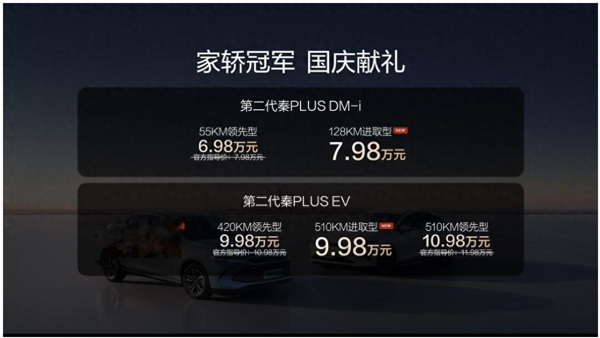 9 月 25 日,比亚迪第二代秦 PLUS 双车焕新上市,推出秦 PLUS DM-i 128KM 进取型、秦 PLUS EV 420KM 及 510KM 进取型三款新车,全系享限时国庆献礼价 6.98 万元起,以高性价比回馈消费者。
