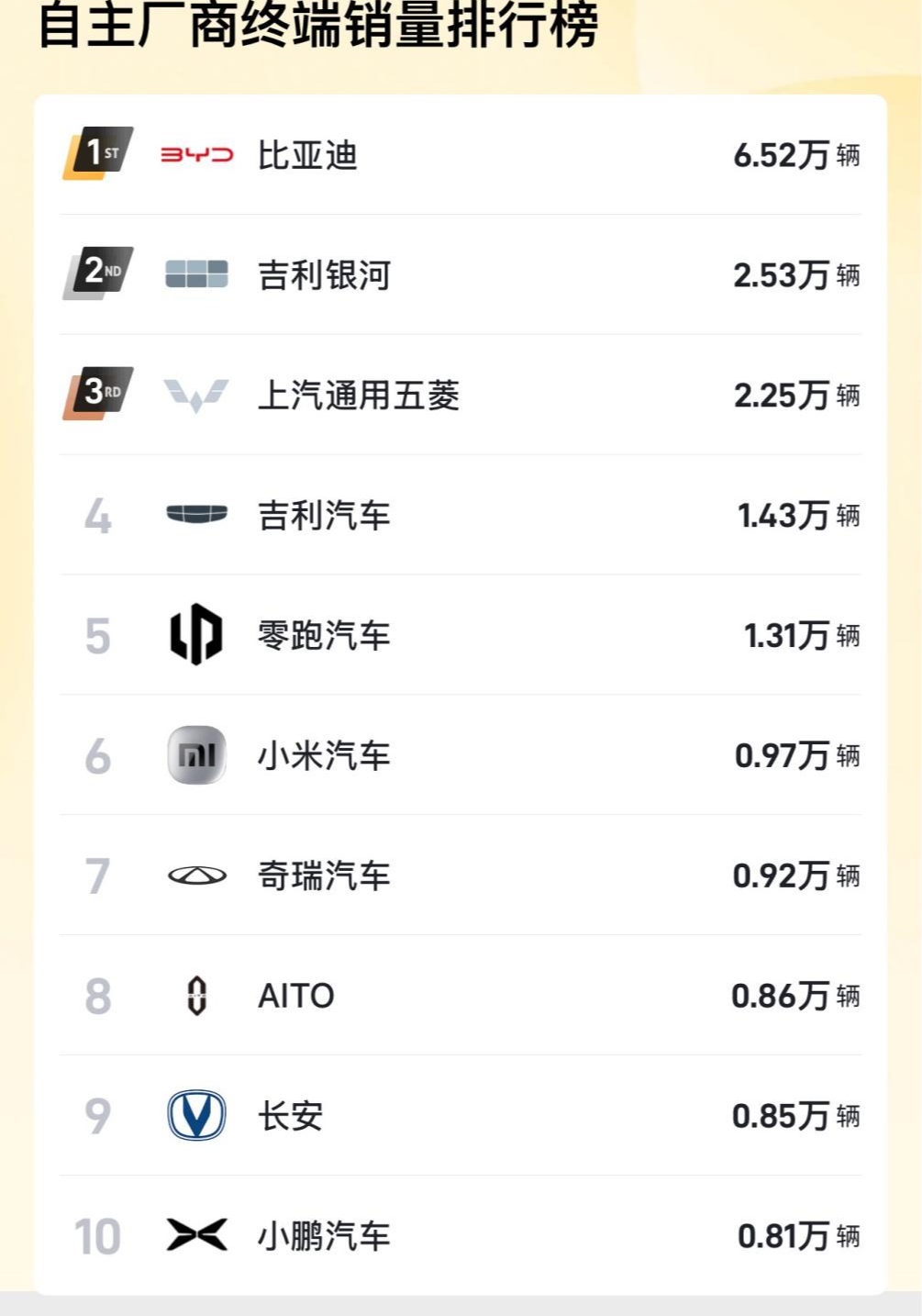 要知道销量能够说明很多问题,而零跑的销量今年一直是越跑越稳。9.8-9.14的周销量表现中,零跑以1.31万辆的销量成绩更是跑到了自主品牌第五名的位置,在它前面只剩传统汽车品牌了!