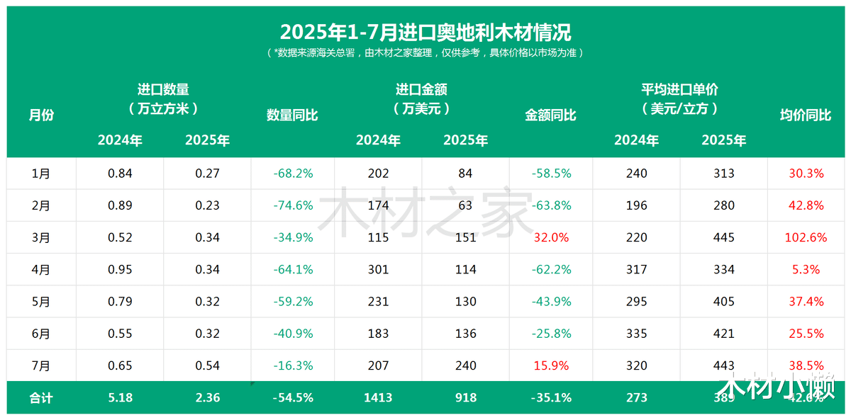 以奥地利为例,海关数据显示,2025年前7个月,中国从奥地利进口的木材总量仅为2.36万立方米,较去年同期大幅下降54.5%;进口金额达到918万美元,同比下降35.1%。