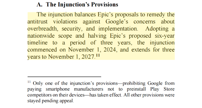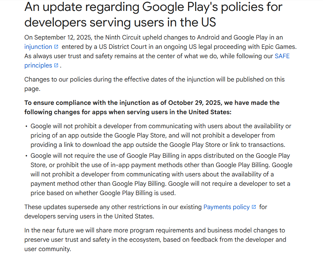2025年10月,法院针对Google与Epic Games的诉讼案件下达了一项为期三年的禁令,自2024年11月1日生效,至2027年11月1日为止。根据这一禁令,Google必须从2025年10月29日开始,在美国站点允许开发者使用除Google Play Billing之外的支付方式,并可告知用户其他购买选项。